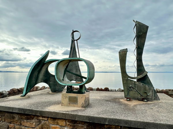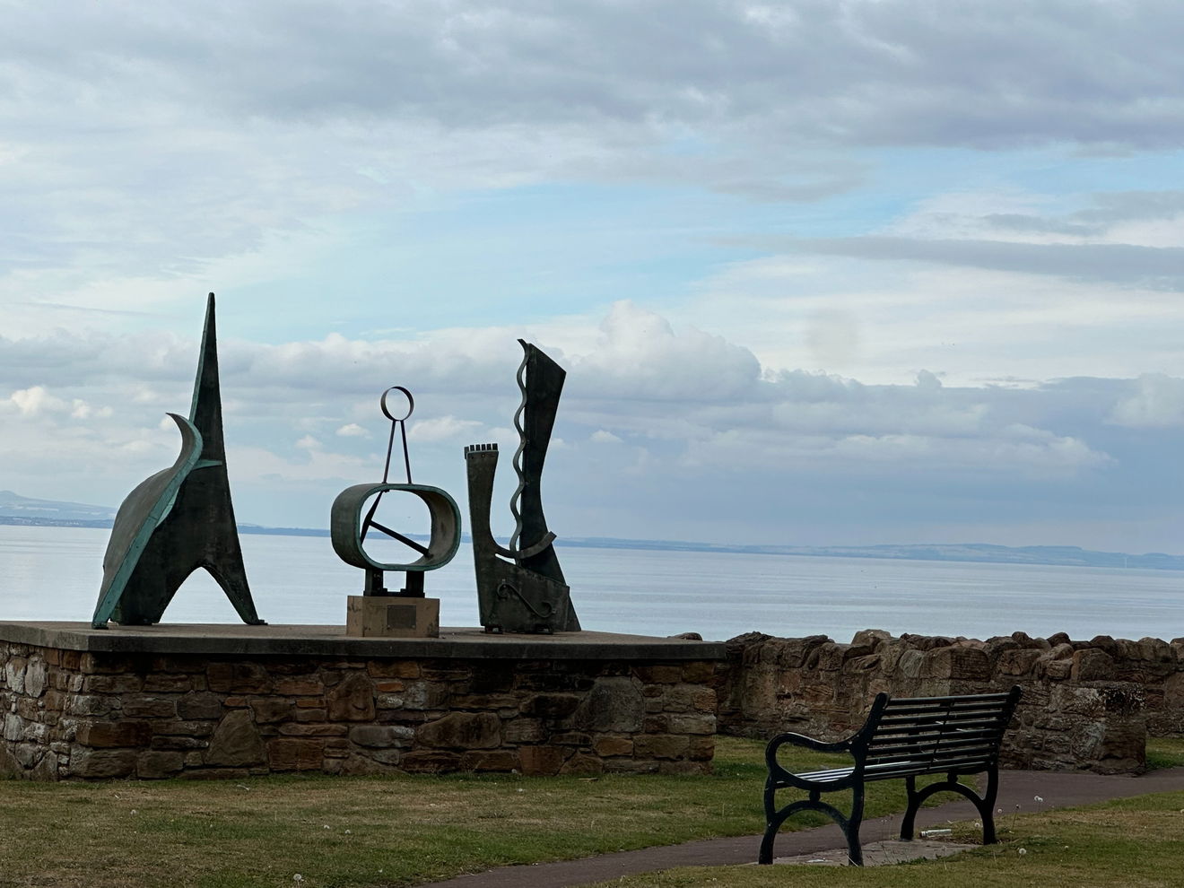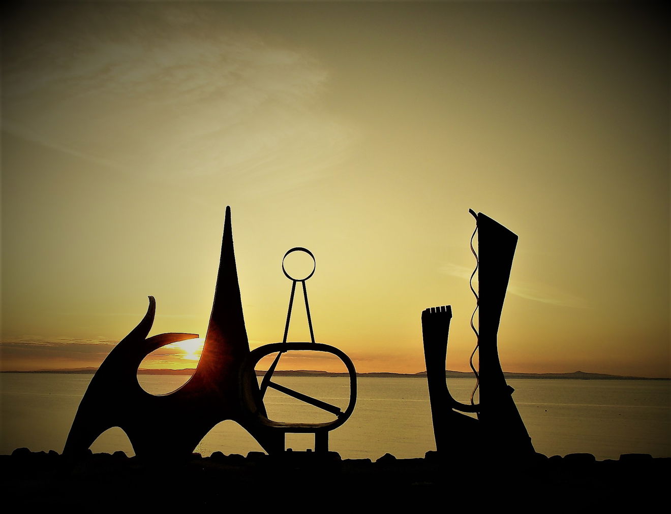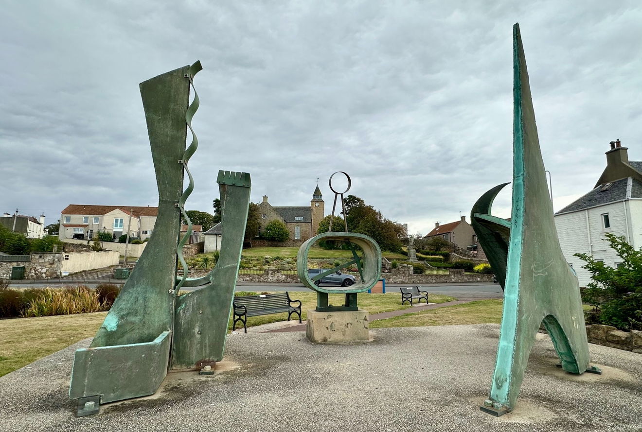 A collection of bronze and brass sculptures, abstract shapes, spitting out their edges over the sea at Prestonpans.