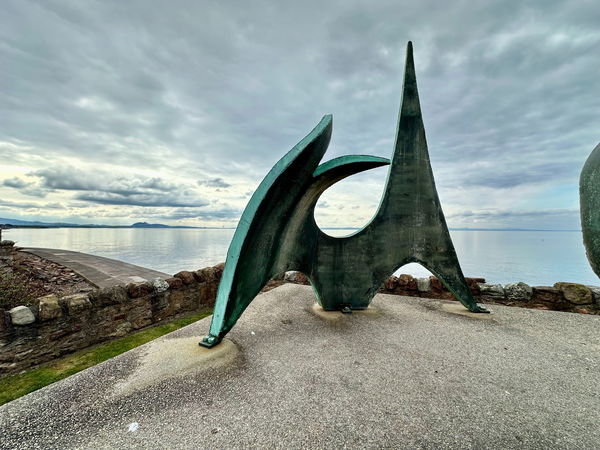 There's a clear sense of fluidity and movement and a definite seaside suggestion of high breaking waves to the left. Look at the piece to the right, like the repeated ripple of a lolling wave rolling into the sand, and the soft, gentle pull of the sea to the shore. From another angle, it could be a dorsal fin of some Scottish cetacean, or the open wings of a Shag, airdrying in the breeze, the green patina of the bronze like the metallic, almost oil-slicked green of its feathers. Is it a bird or a dolphin's fin, or waves on the hull of a boat for you?