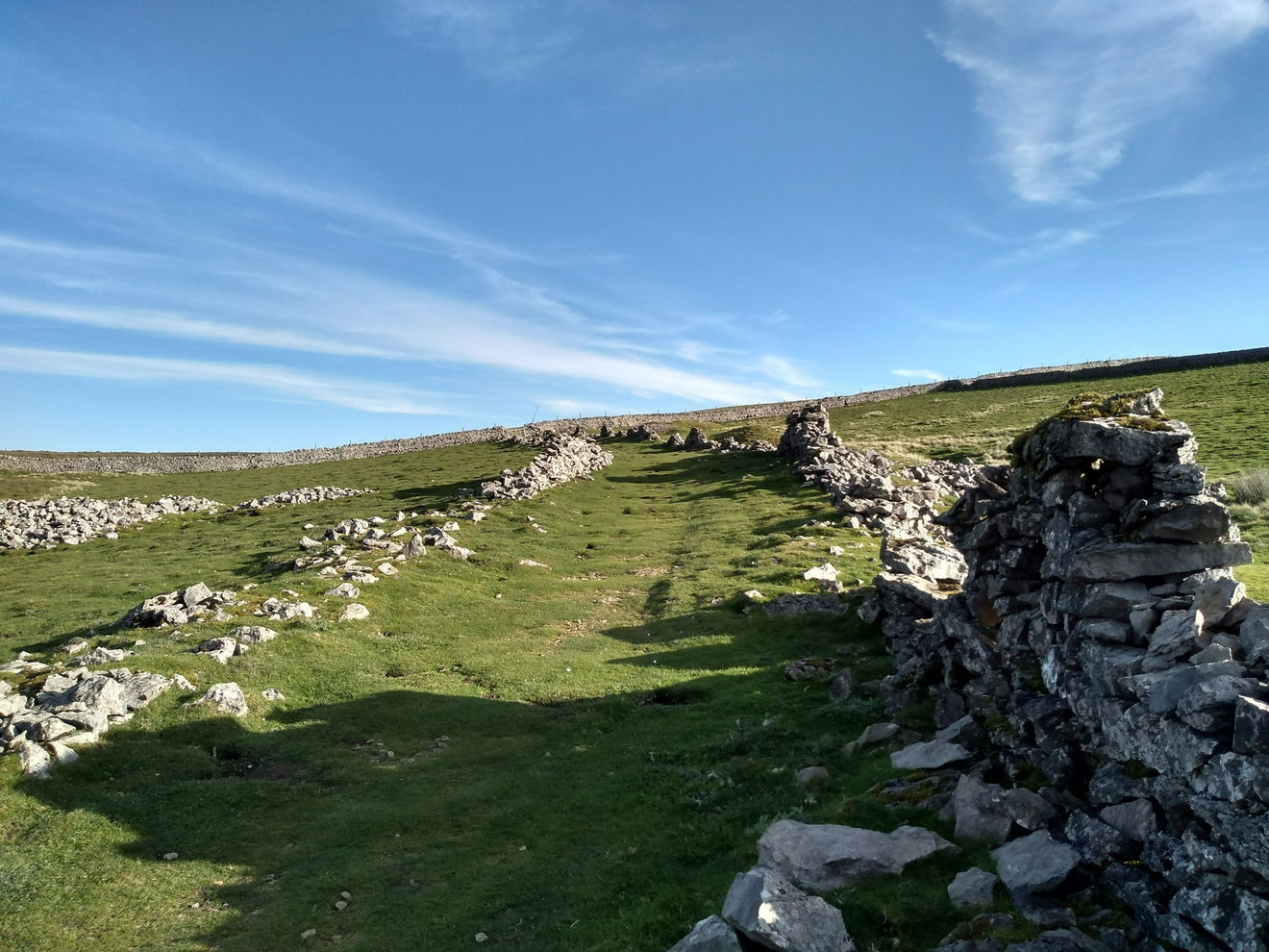 The track climbs and contours the side of the hill heading south. Pass through a few gate before turning left and heading through a large area of stone sheepfolds.