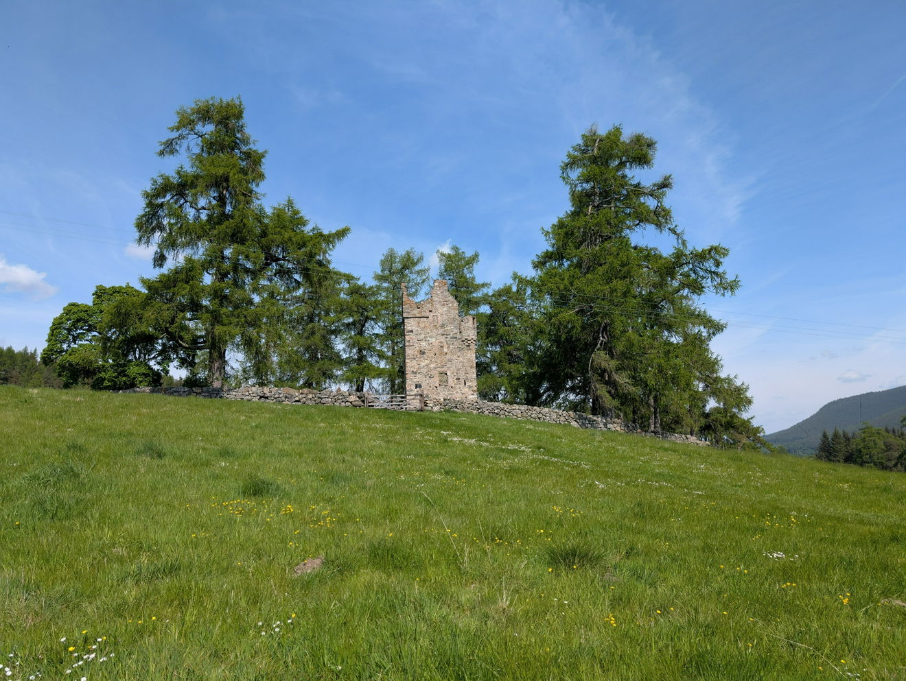 The castle itself sits on a knoll in a field to the south of Craig of the Knock at the entrance to Glen Muick. The rectangular tower measures about 8.2m by 6.7m and has 1.2m thick walls. Although the tower is ruined and roofless, the remains of a vaulted basement (used as a kitchen) and a spiral staircase can be seen.