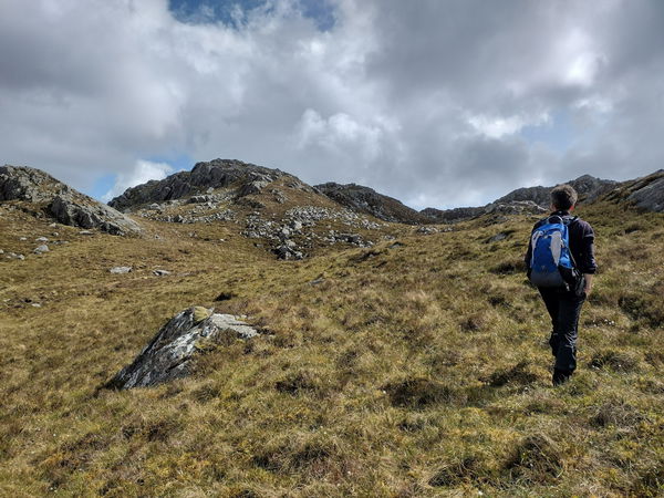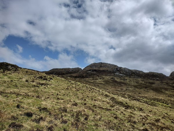 When the path branches, you need to head up grassy slopes keeping Leac an Fhidhleir to the left and the large craggy lump to the right.