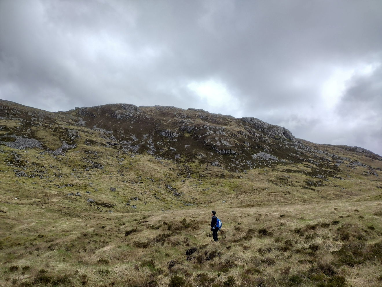 You start your ascent by heading south easterly up the steep grassy slopes, keeping to the left of the large rocky outcrop and scree.