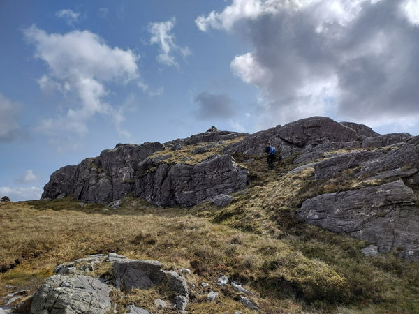 The route is pathless, but there is a grassy sections between the many crags. Keep head north west until the trig point comes into view.