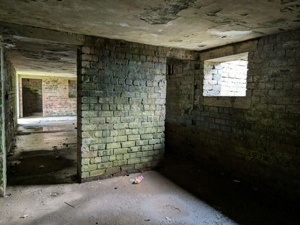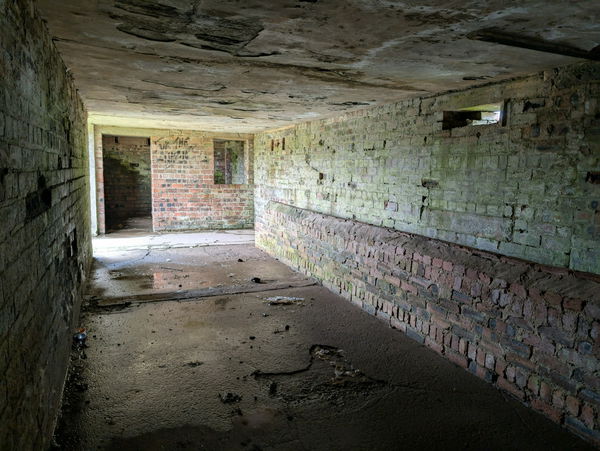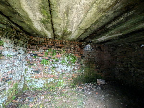 The 6.2m square structure has 0.4m thick brick walls which are 1.5m high and it's topped with a reinforced flat concrete roof. Unfortunately, I was unable to access the building for a nose around inside.