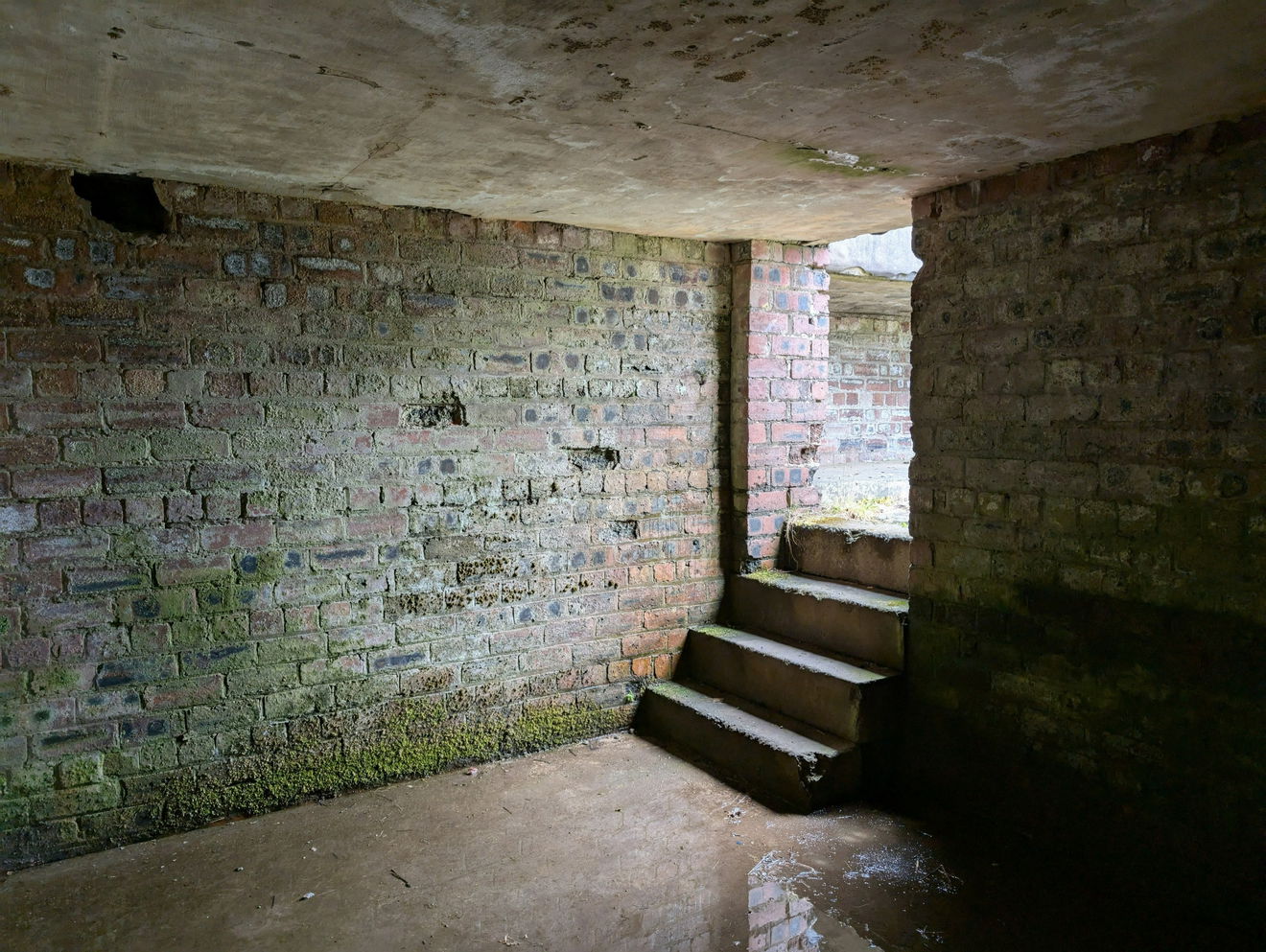 There are five ammunition vaults in each gun pit, each has a flat concrete roofs with raised concrete floors. They would also double as bomb shelters due to there depth.