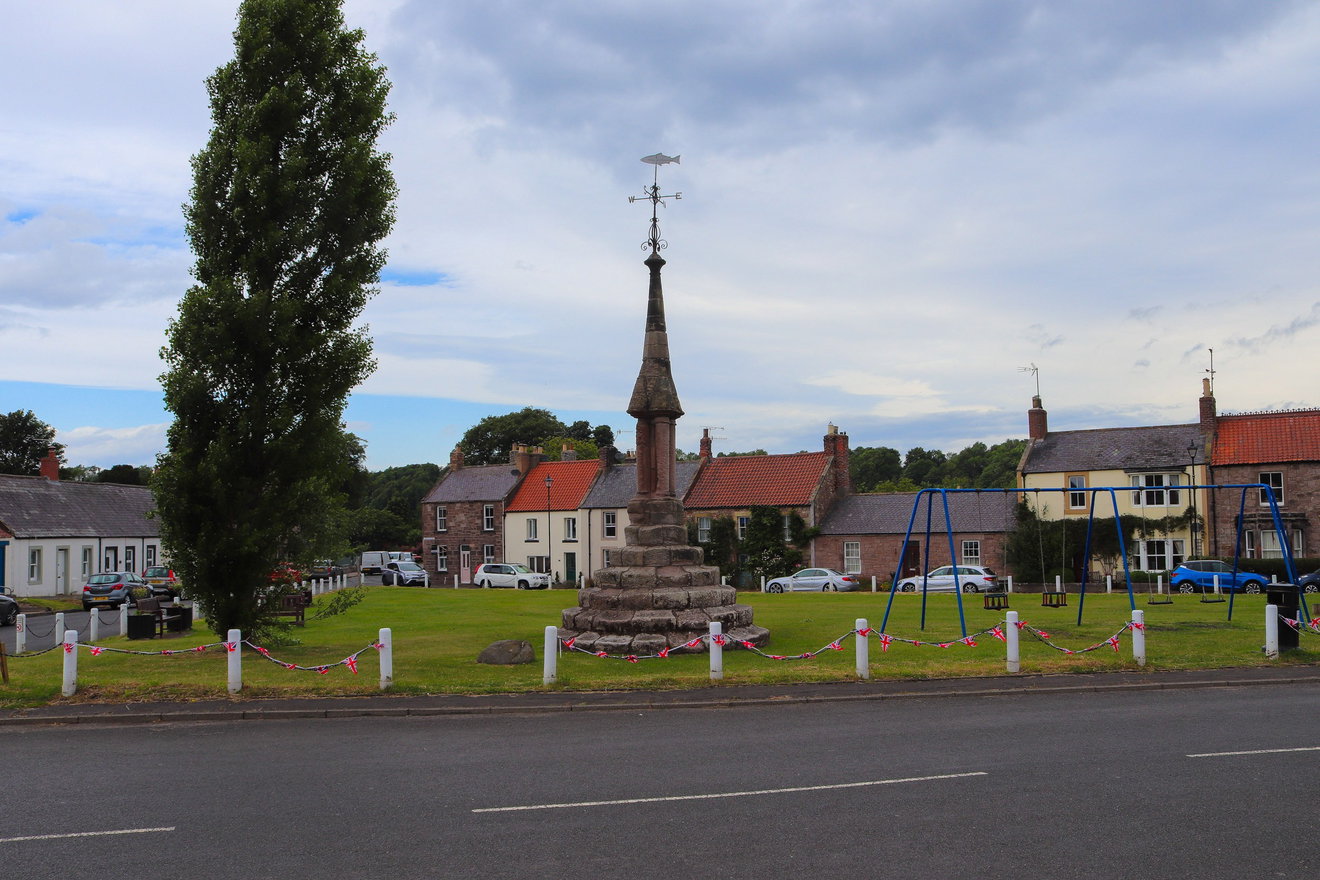 A medieval base with Victorian shaft surmounted by a salmon-shaped weather vane, marking the centre of Norham village life.
