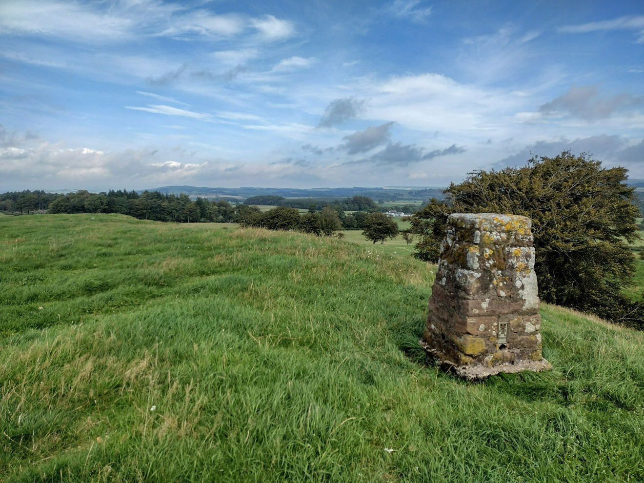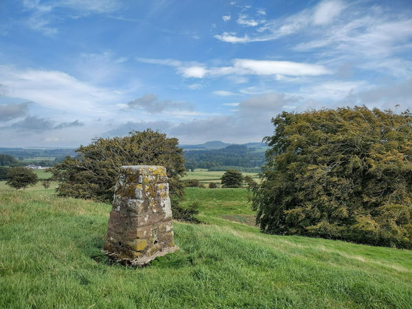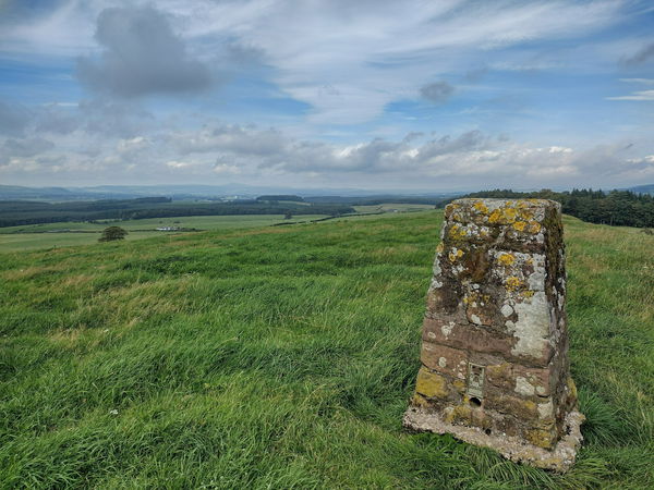 This is the Nutholm Hill trig point (120m) near Kirkbank, which also happens to be a hill fort.
