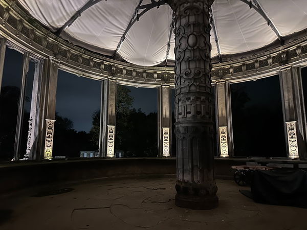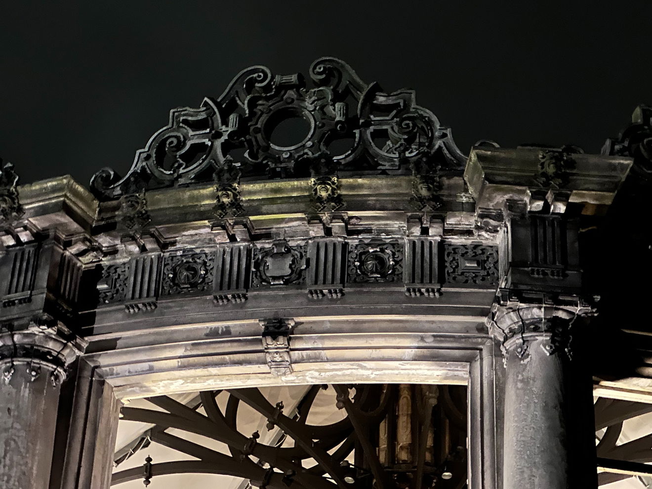 Twelve Craigleith sandstone pillars, ornately cuffed in geometric diamonds, squares and swirls, hold the shape of this structure and would have been the support for enormous windows.