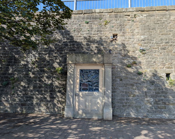 The old joke 'Knock knock, who's there? Dr. Dr. Who?' Springs to mind, and then the question of why doors? It is to represent the past, present, and future, The past door is in the wall and requires a specific angle to view it. Looking through the keyhole, you will see a sailing ship.