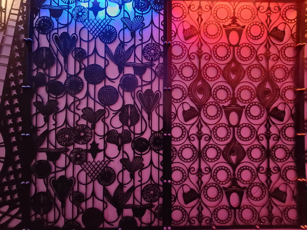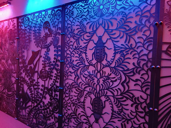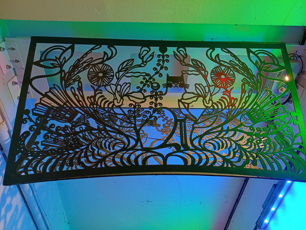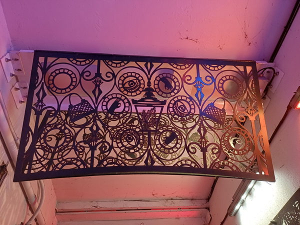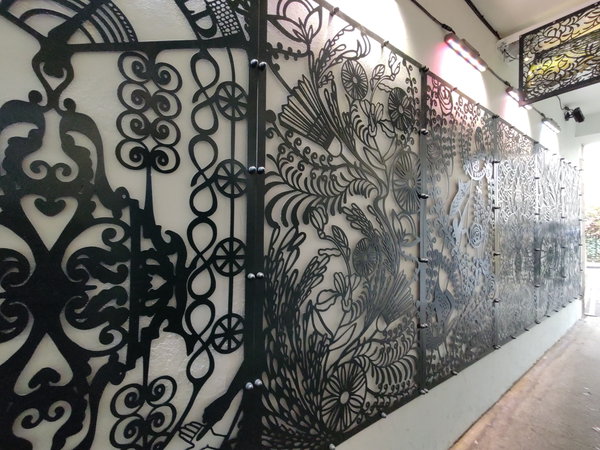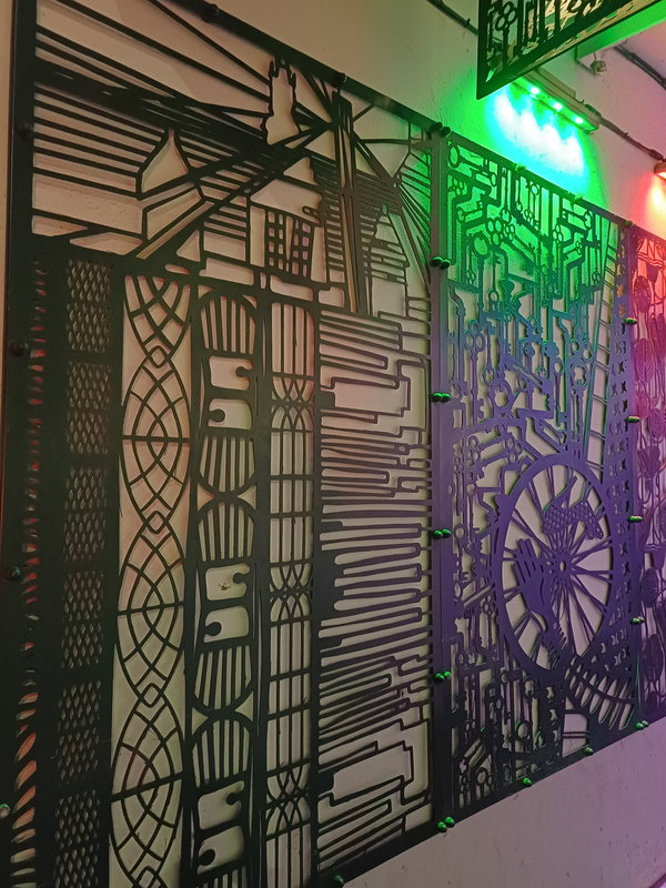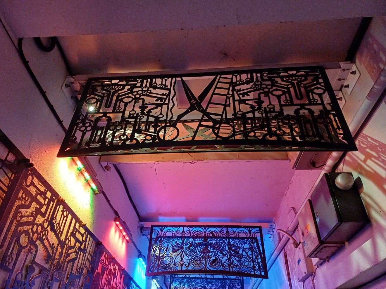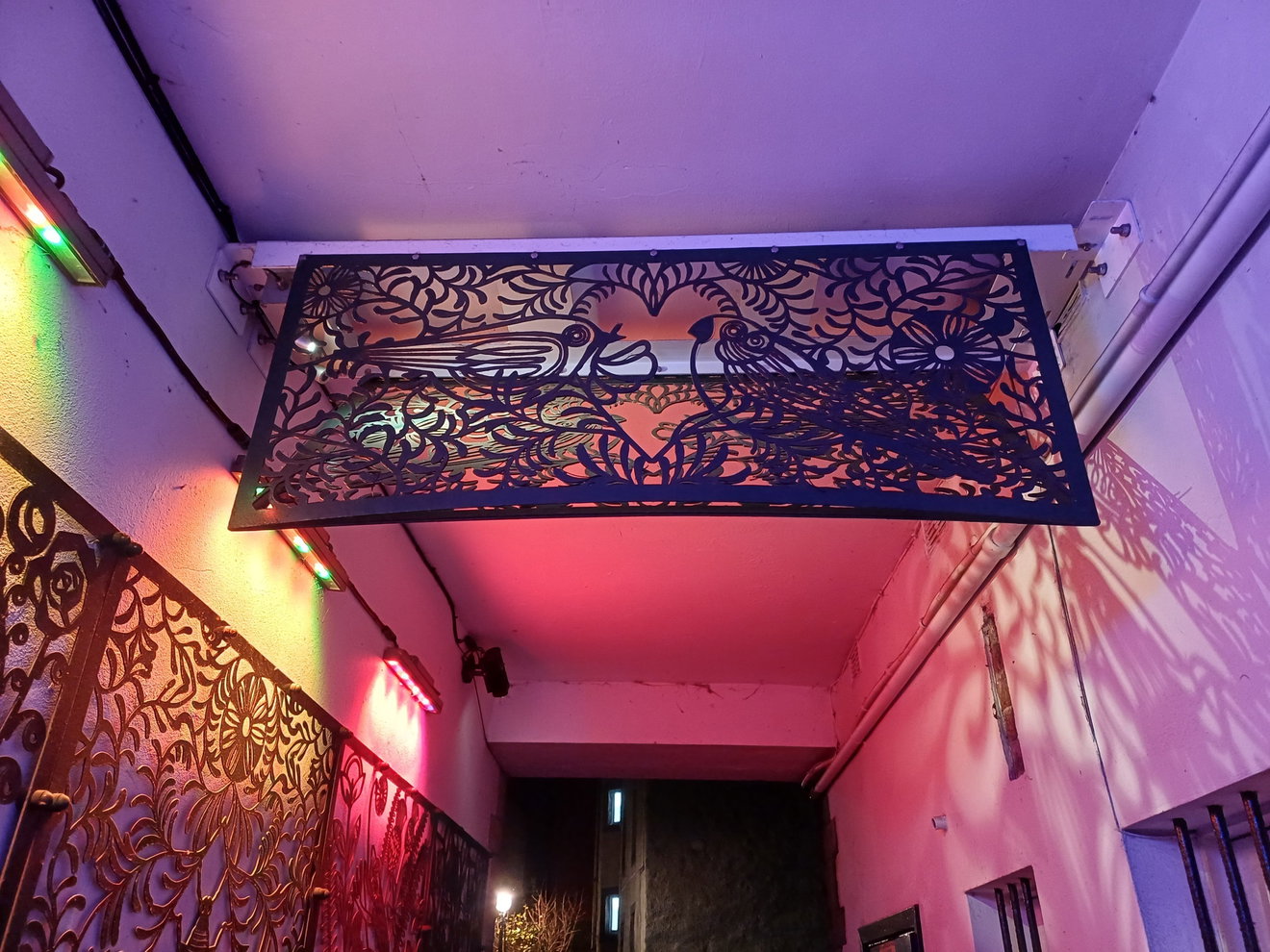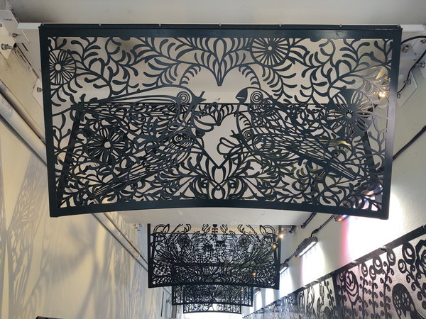 The artworks that decorate this close are cutouts made out of metal and painted black, part of a 2021 project from the team of Chris Dobson as architect, illustrator Astrid Jaekel and project lead/designer Isla Munro. More than just decoration, they tell stories of both ends of the close, their inhabitants and histories. These are explained on information sheets, where the artworks on both wall and ceiling are numbered.