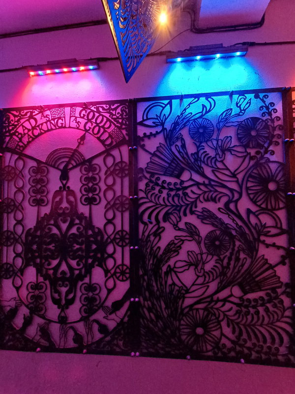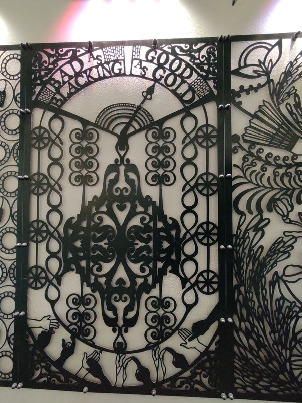 These handbags, lookful eyes and a lamp are repeated on the fourth wall panel. The third panel was unfortunately installed upside-down, but its imagery is still recognisable as snowdrops and sombreros, honouring a beloved and now-gone Mexican restaurant as well as the area's springtime flora.
