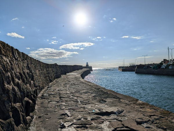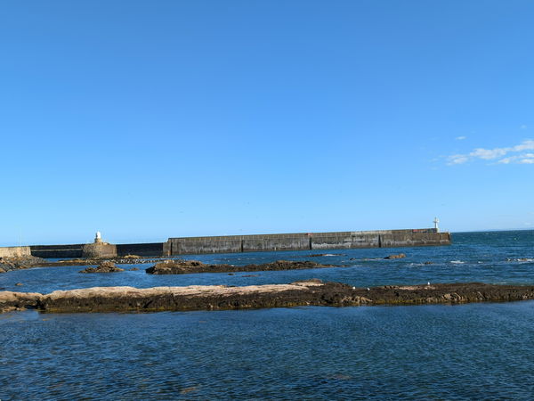 As you walk along the extended part of the pier, the natural skerries can be clearly seen as well as the old boat harbour and pier.