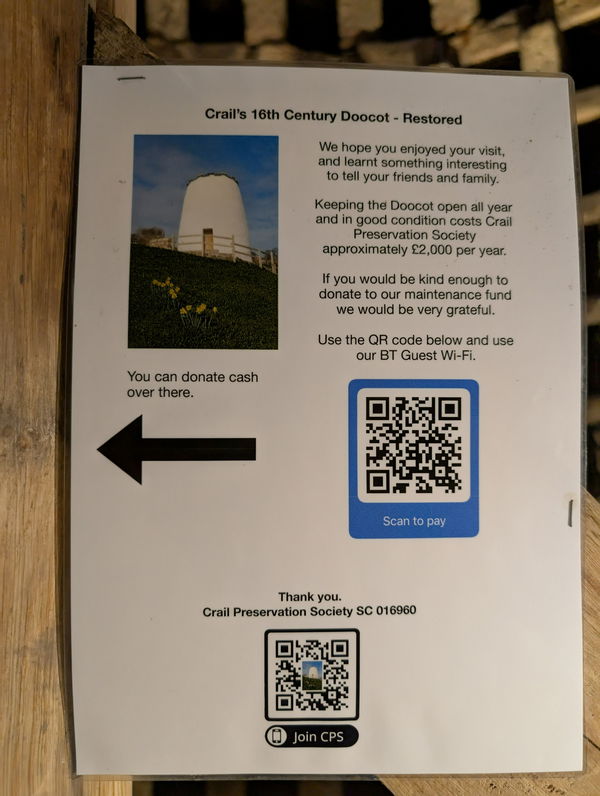 The Crail Restoration Society have a page with details of the full CPS Restoration project. The restoration was funded by grants from Historic Environment Scotland, the Heritage Lottery, Crail Common Good Fund and Helen Main Fund. The full amount was raised by May 2017 and the first dig started 1st June 2017. The Doocot was re-opened on 18 May 2019 by the Lord Lyon King of Arms.