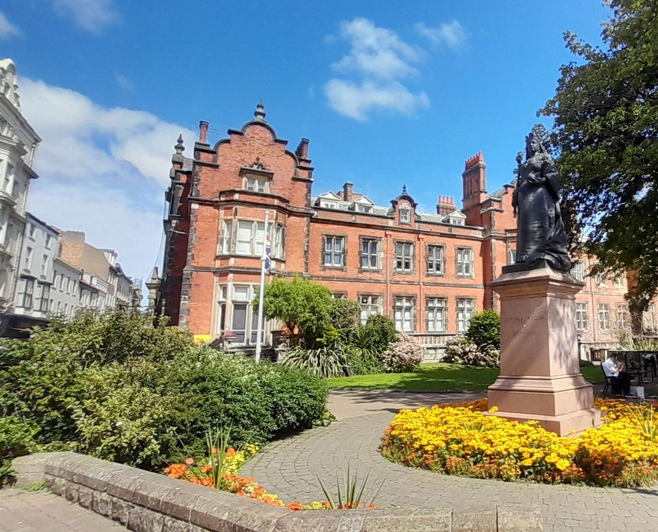 A bronze statue of Queen Victoria outside Scarborough Town Hall.