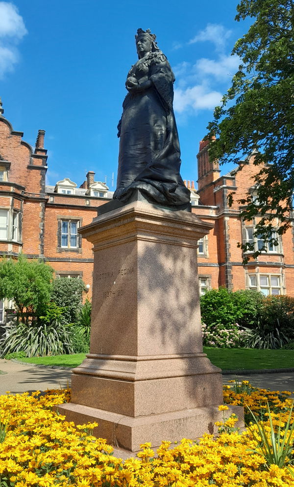 Charles Bell Birch (1832 to 1893) was commissioned to mark Queen Victoria's Golden Jubilee in 1897 and carved a statue in Carrara marble which is an off white colour from North West Italy. It was for Udaipur in India. Subsequently, at least eight copies have been cast in Bronze. They are in Aberdeen, Australia, Derbyshire, Guernsey, London, and Newcastle Under Lyme. This one was installed in 1903.