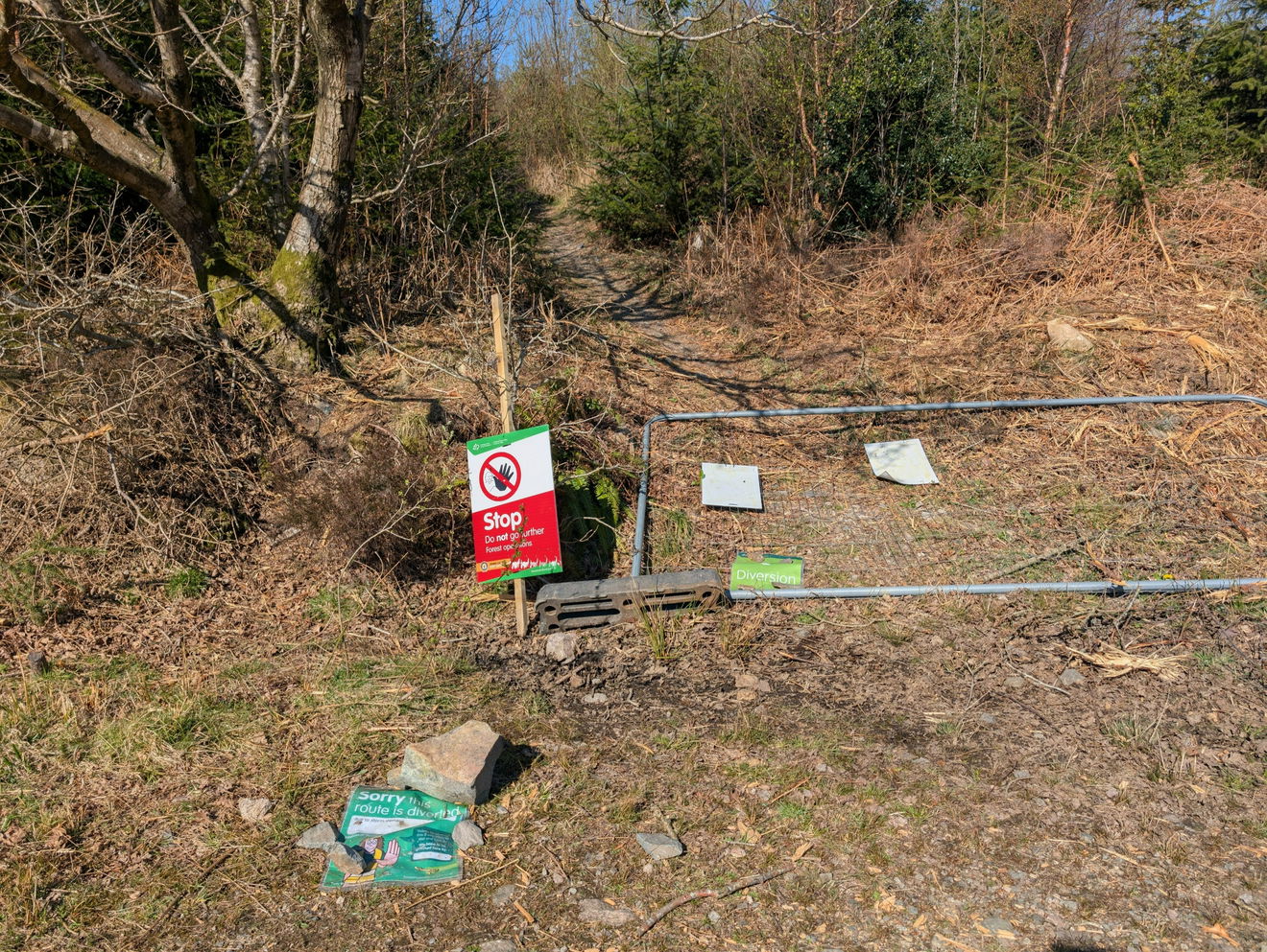When you reach the track, the original path heads straight over, however, due to storm damage, this route is closed. We did check it out, and some trees are down blocking the path.