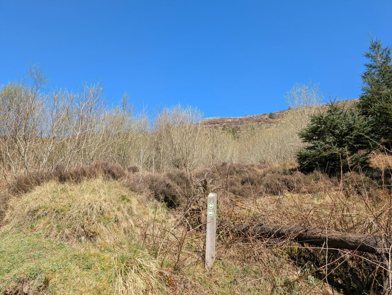 When you reach the finger post on the right, leave the track and take the path as is carries on climbing the contour of the hill.