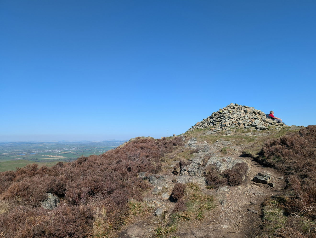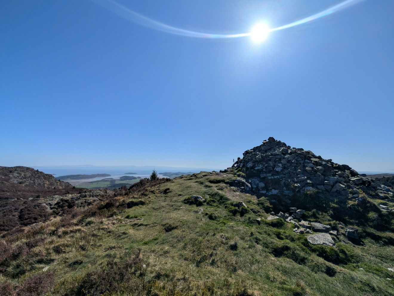 The path eventually turns right for the final pull up the hill, there is a small scramble before the large cairn comes into view.