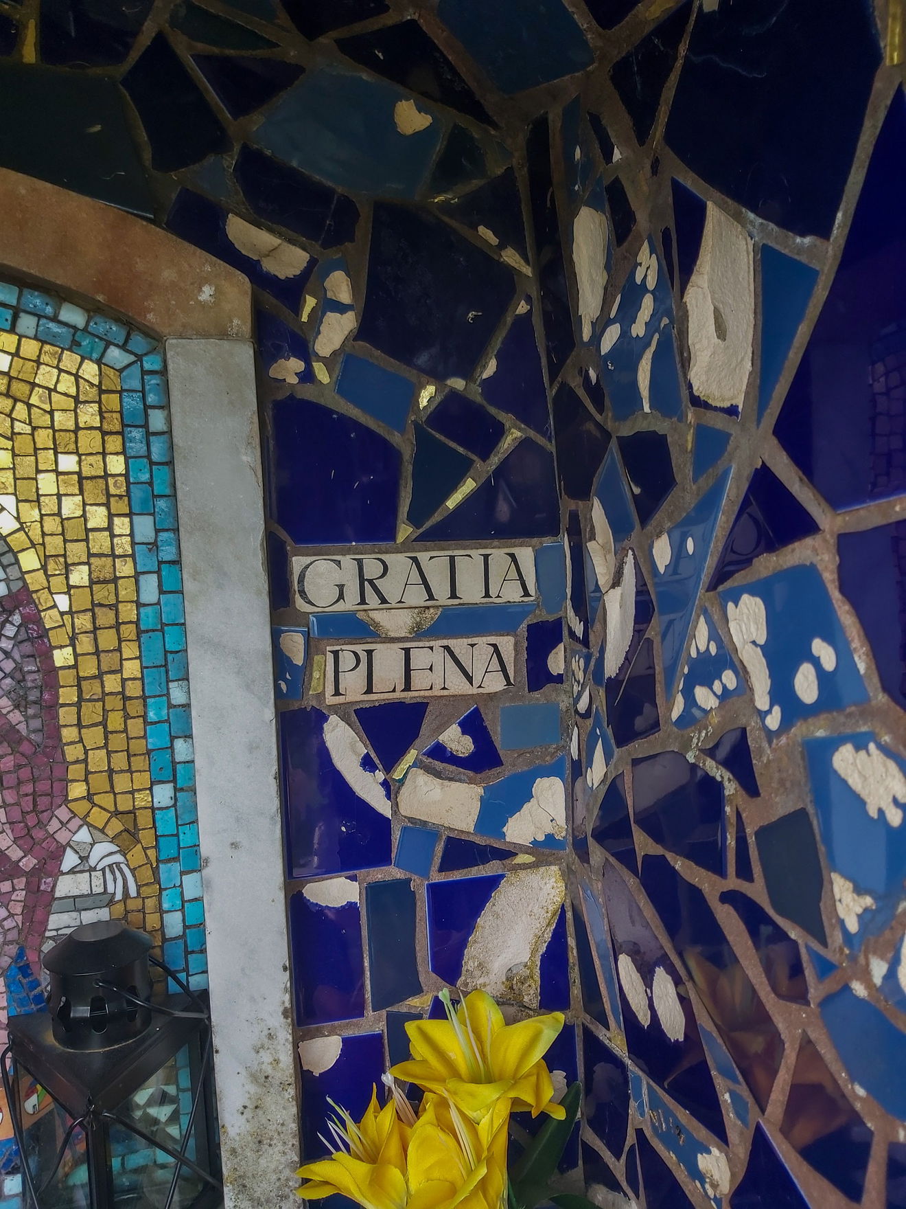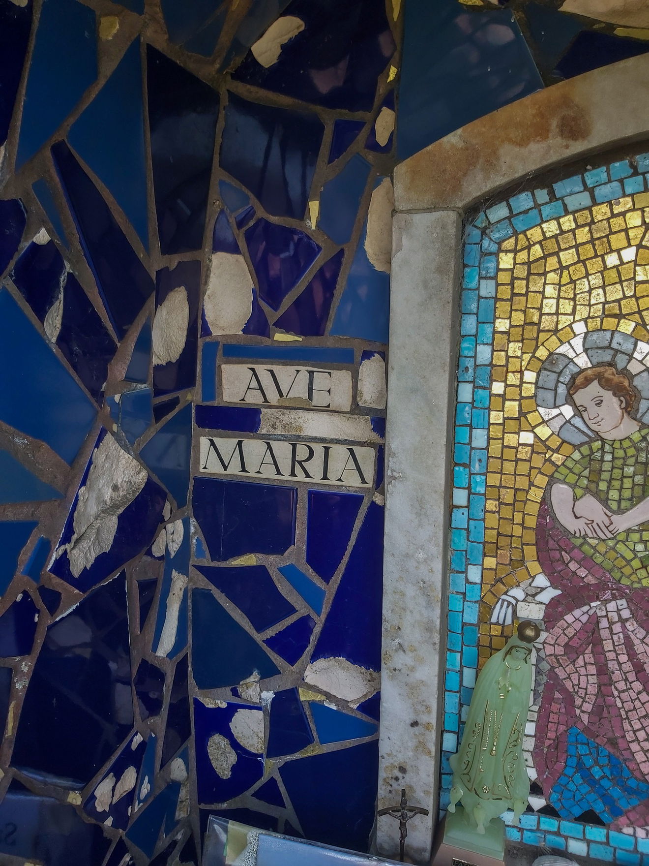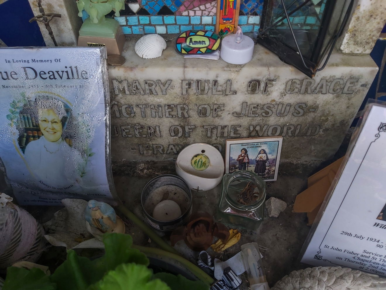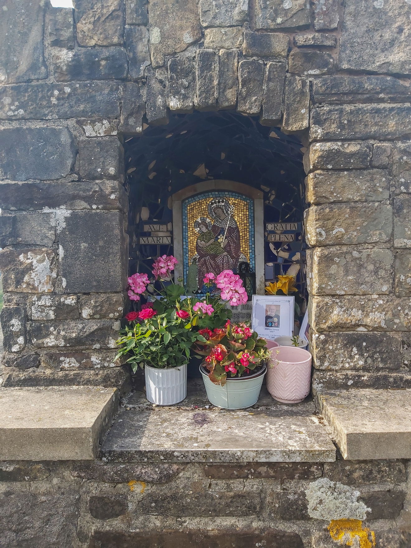 The shrine is made from local sandstone and on top is a slate-roofed stone canopy, containing a recess into which the picture of The Virgin Mary could be placed. The mosaic inside is a gorgeous blue colour and to the left of the main image reads 'Ave Maria' (or hail Mary) and on the right, 'Gratia Plena' (full of grace). There is also an inscription which reads: 'Hail Mary full of grace, mother of Jesus, Queen of the world, Pray for us'. Parishioners visit regularly and maintain the shrine and there were some flowers and dedications placed inside it when the FN team visited in Autumn 2025.
