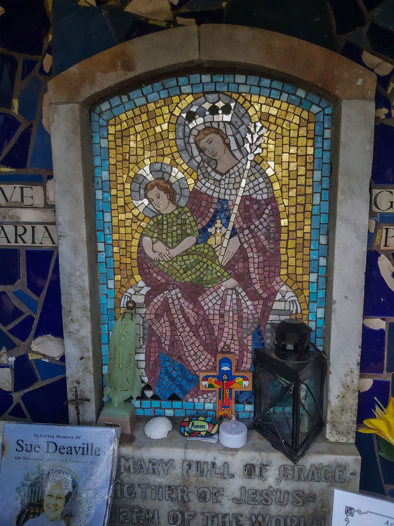 There was considerable damage done in the early 1990s after a vehicle ploughed into it, knocking the entire shrine off its base and destroying the mosaic art work inside. Repairs were made to it and it was reinstated and reconsecrated in the mid 1990s. Restoration work to the interior was carried out by painter Stephen Rose and Stephen very kindly took the time to tell me how he was involved in the restoration process: