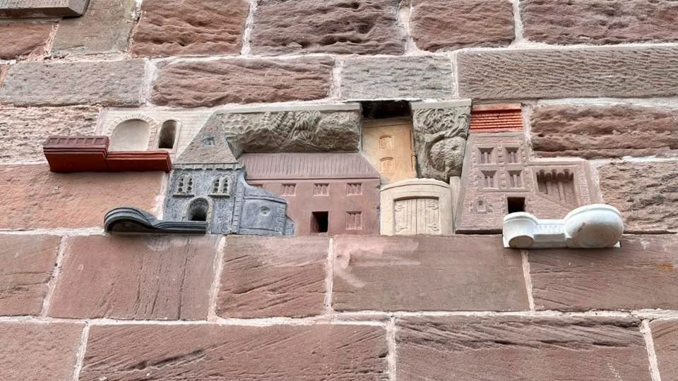 Look at the towering grey church with its angular steeple and lancet windows. It's neighbours with what appears to be an old warehouse. There'd be plenty of these along the estuary at Tweedmouth for inspiration. Then a fancy pants little bowed gated bit...maybe leading to the posh ochre house behind, flanked by an intricate tree carving and foliage on either side. I loved what I imagined to be a red-roofed monastery at the end, with what looked like steps leading to the cloisters. So detailed and delightful. And best of all, the houses all had inhabitants, little winged residents who'd claimed their spot in the stonework.