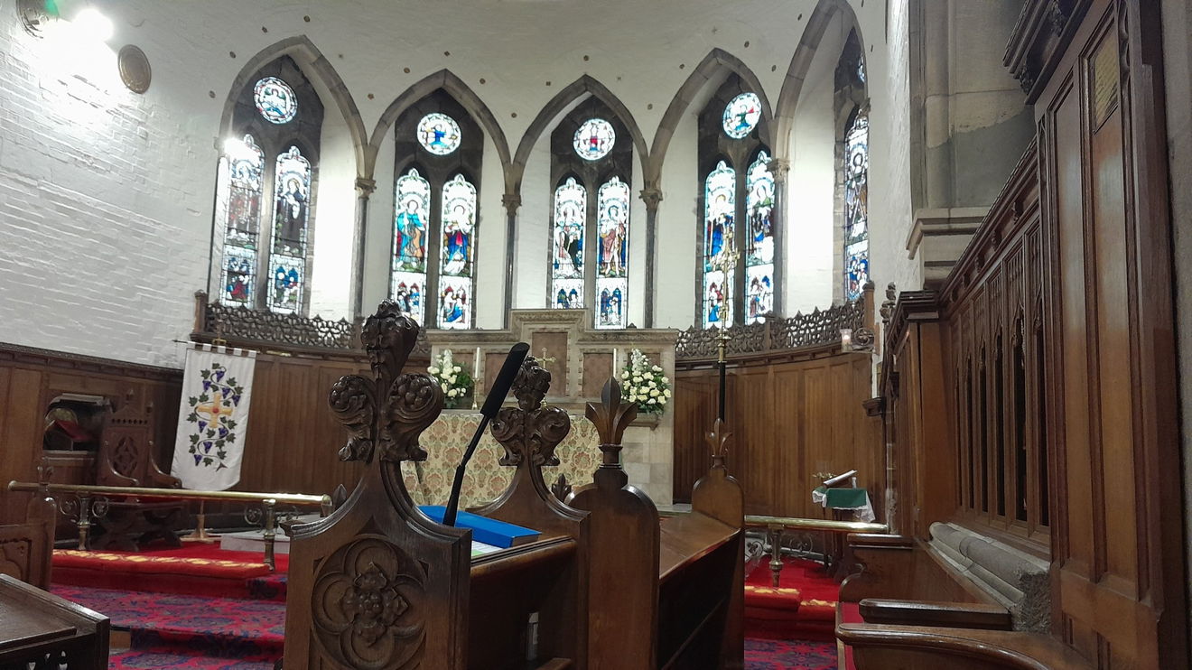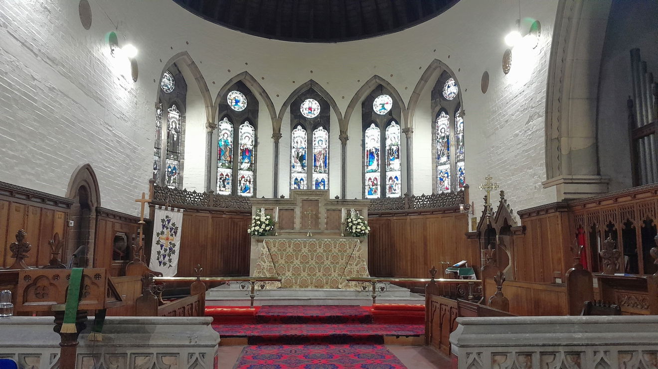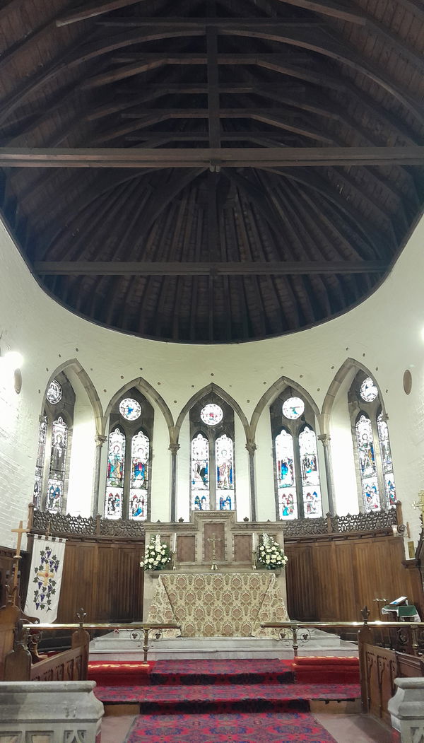 The apse at the east end, behind the altar, has five pairs of stained-glass windows depicting saints.