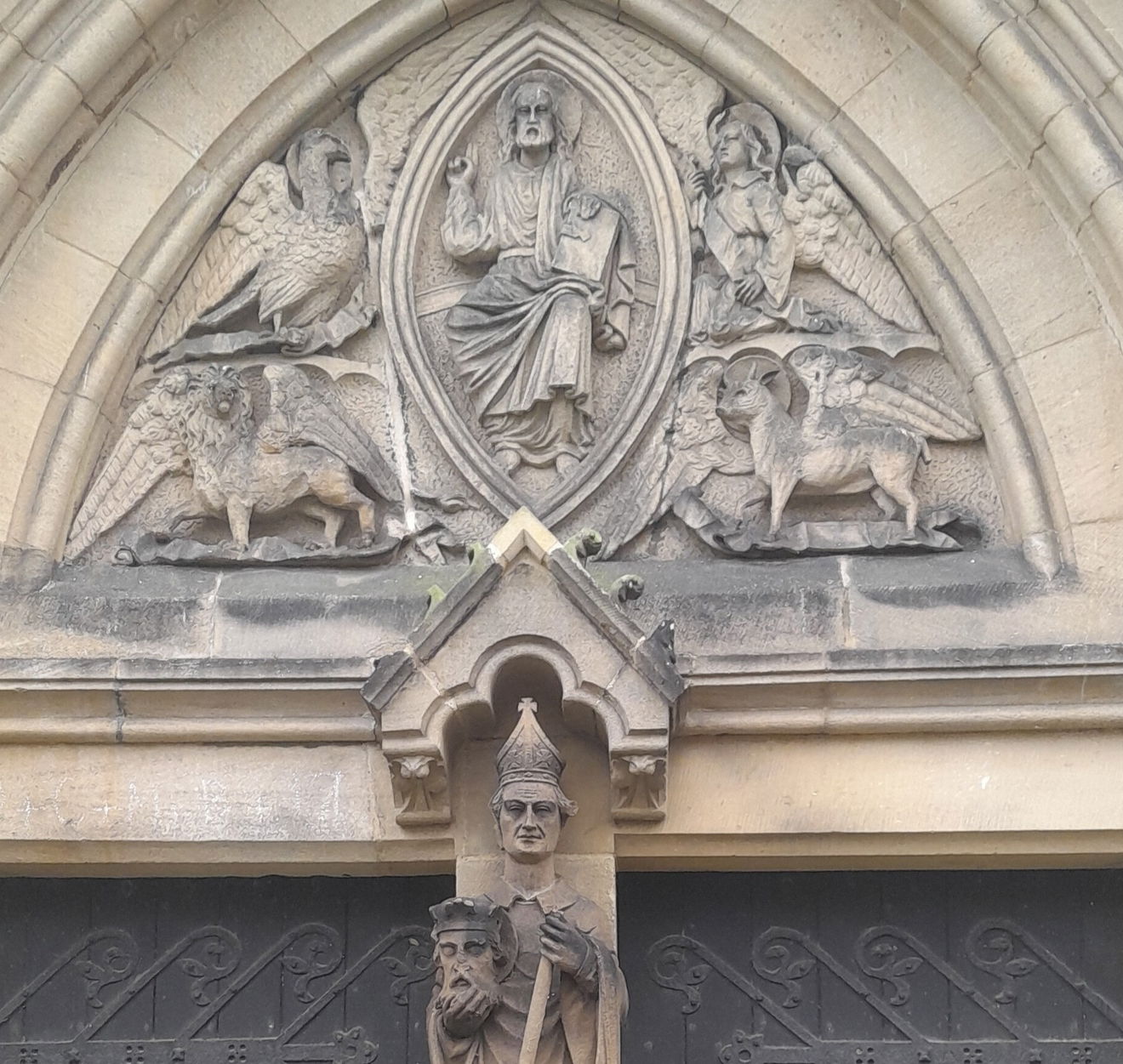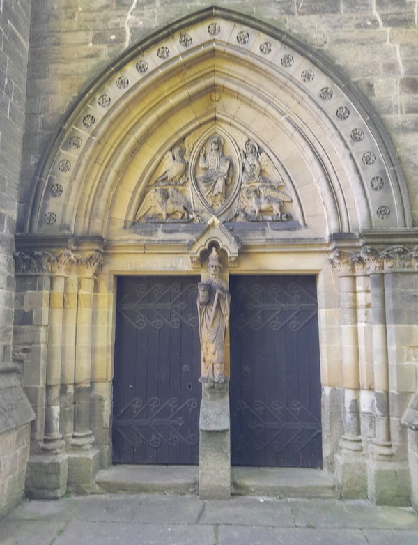 The west entrance, which is not used, has so much detail to acknowledge: It has two oak doors with fleur-de-lis hinges. The entrance is surrounded by Corinthian pillars and hood/drip molds. The statue in the middle is, of course, St. Cuthbert, holding the head of St. Oswald. Look closer, and you can see St Cuthbrt's furrowed brow!