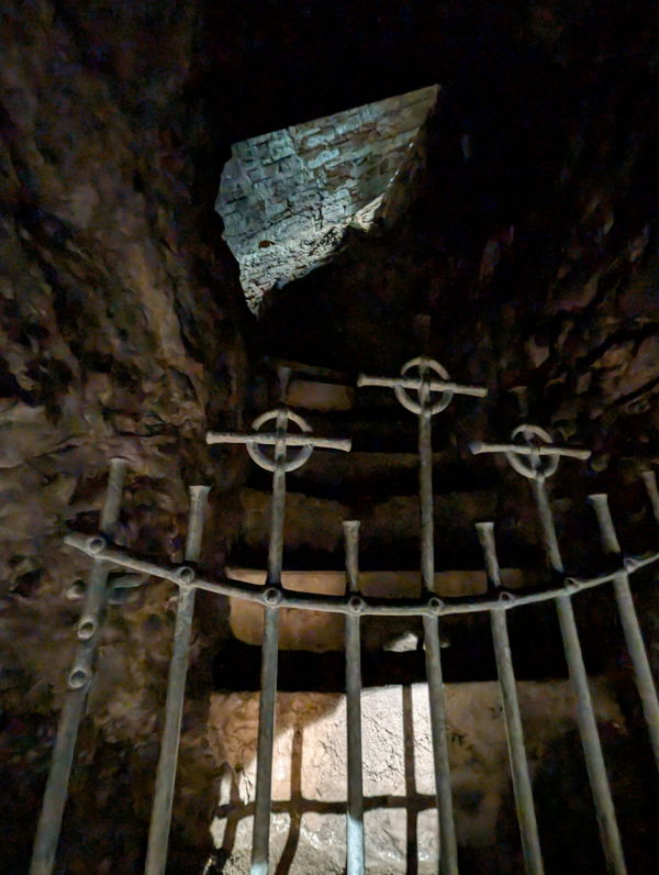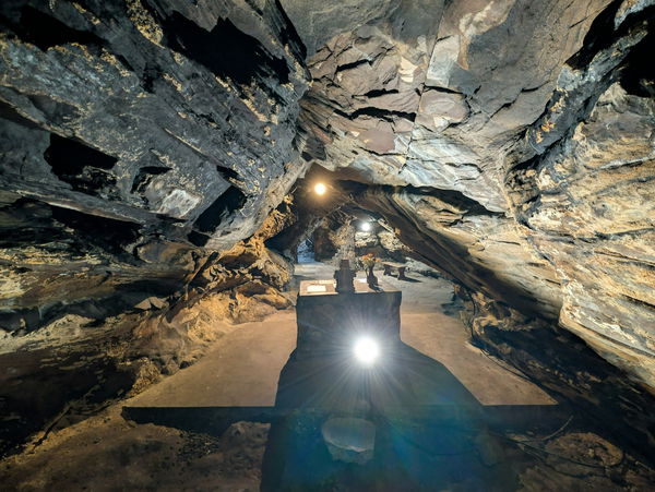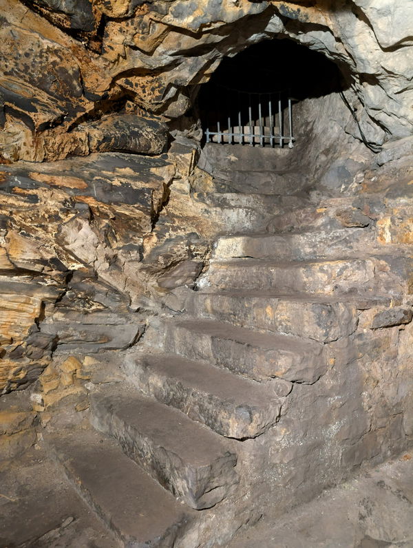 You enter the cave into the first cavern which contains the handrail down to a table with information and a beautiful picture. As you make your way further into the cave, you enter the main cavern where there are steps up to another old cave entrance as well as two further caves at the end of the cavern. Of course I had to have a peek up the old entrance, fortunately it is blocked off, preventing me from getting myself stuck.