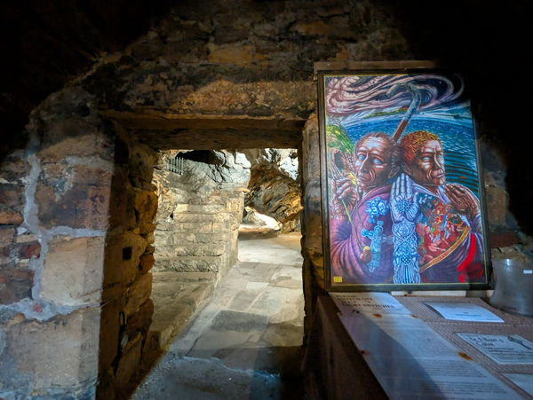 The cave entrance can be found up one of narrow streets named Cove Wynd, which is just up from the harbour. To access the cave you will need to obtain the key from the Cocoa Tree Cafe. Head past the cave entrance to the top of the hill. Turn left and the cafe is on the right hand side. The cave is managed the St John's Scottish Episcopal Church and they charge a small fee of £2 with a £10 deposit which is returned when the key is handed back.