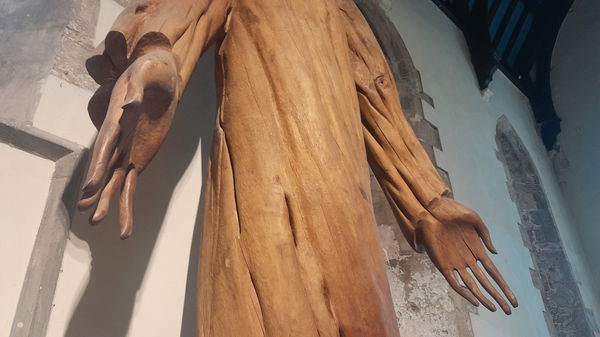 The Risen Christ seemed to strike a chord with Lawson and there are similar ones in other places. This piece was intended for anabbey, but they declined it and somewhere else did not want it. When St Michaelswas offered it, the church gave it careful consideration and gave it a thumbs up,and no money exchanged hands.