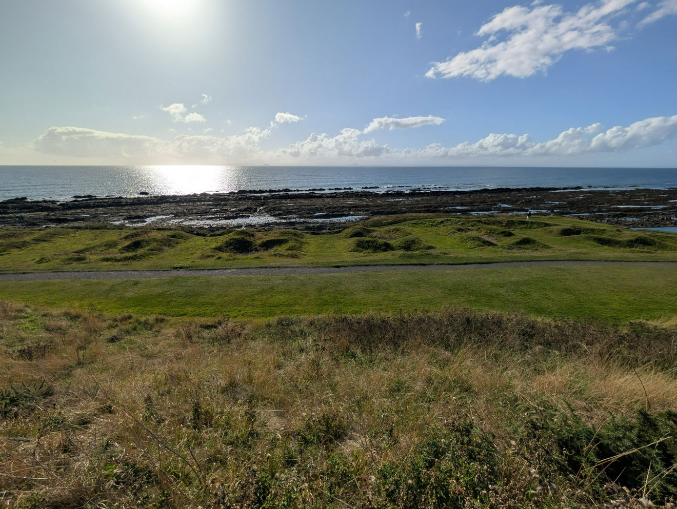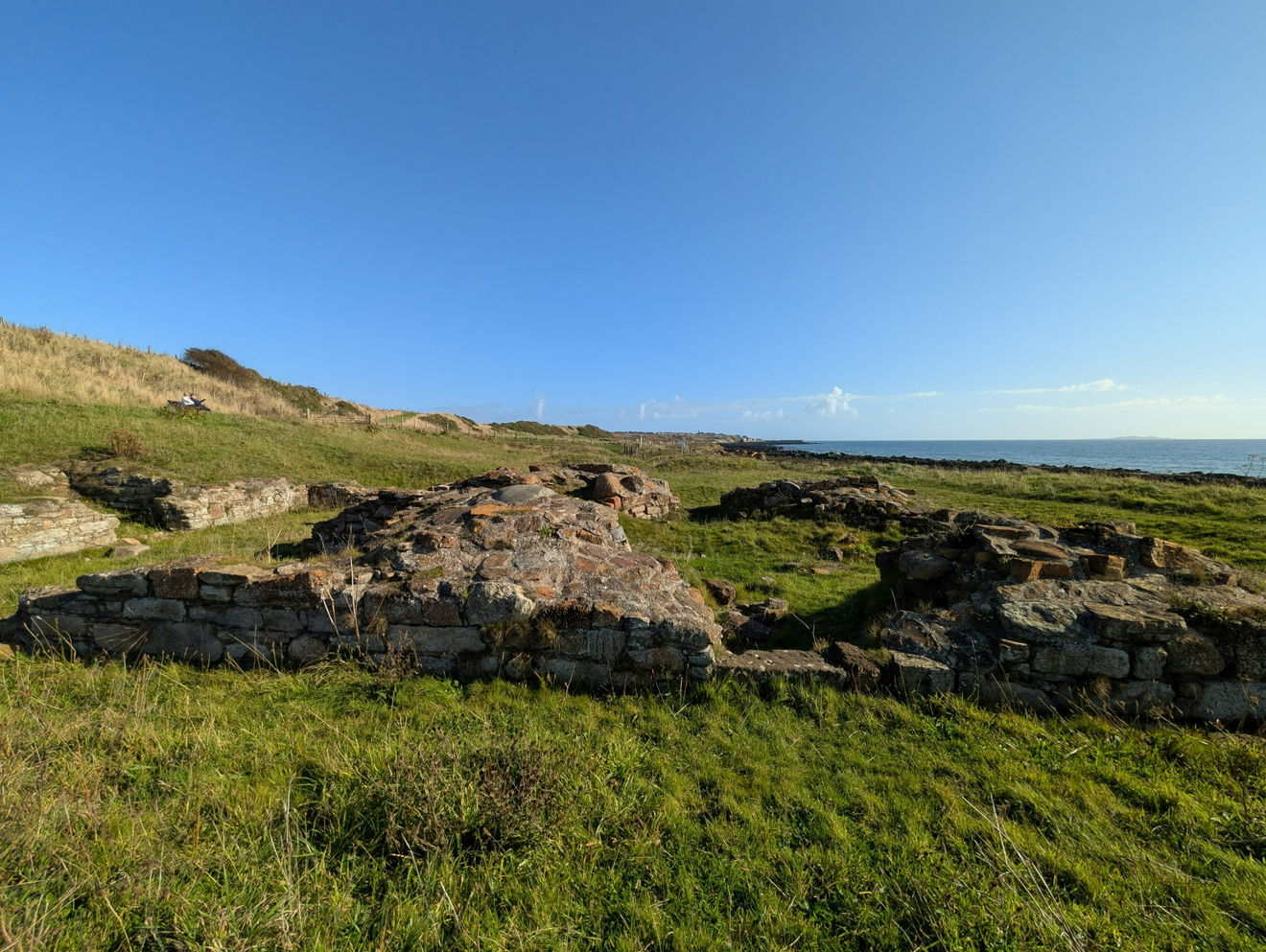 The earthworks of the nine salt pan houses can be seen in an arc below the windmill. Rock-cut channels were uncovered during the excavation, that would have fed water from the reservoirs to the pans.