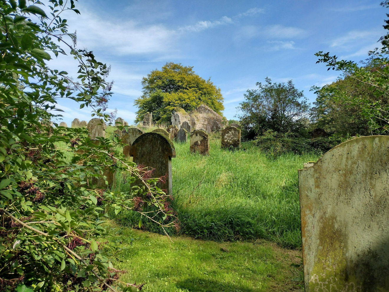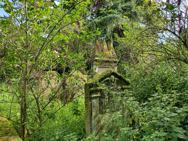 It is worth exploring the overgrown parts of the churchyard, as there are some old and interesting memorials to be found. Some of the headstones are decorated with heraldry and emblems of death.