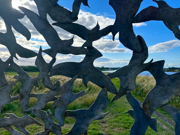 Rob Mulholland is also responsible for the steel volery sphere and patchwork metalwork of avian aerialists on the estuary at Amble. Flock Sphere is an array of ambiguous gulls gathered beak to wing tip, tail feather to tarsus, that enables the individual to climb inside, almost as if we were in an aviary looking out.