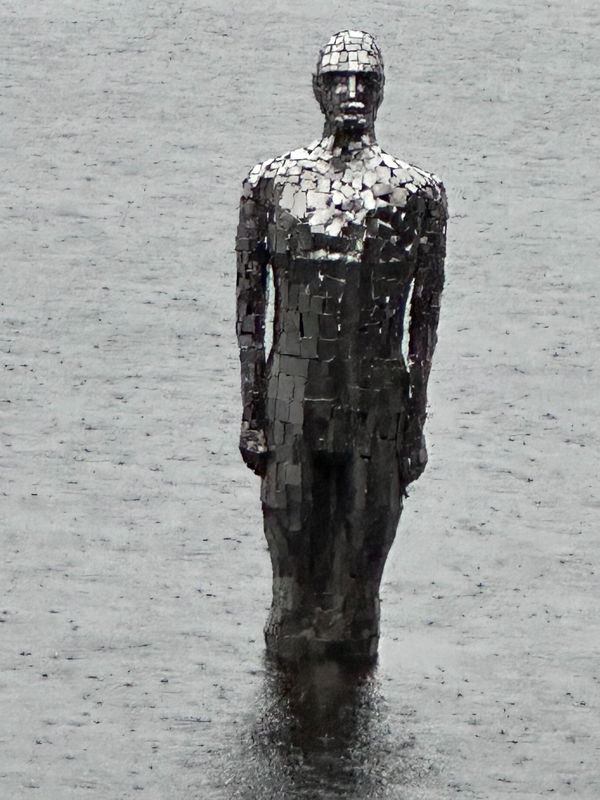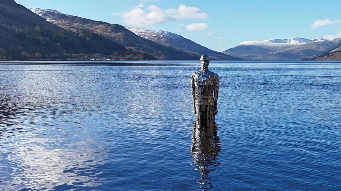 A sculpture of a man made of many mirrors, standing in the depths of Loch Earn at St Fillans near Killin.