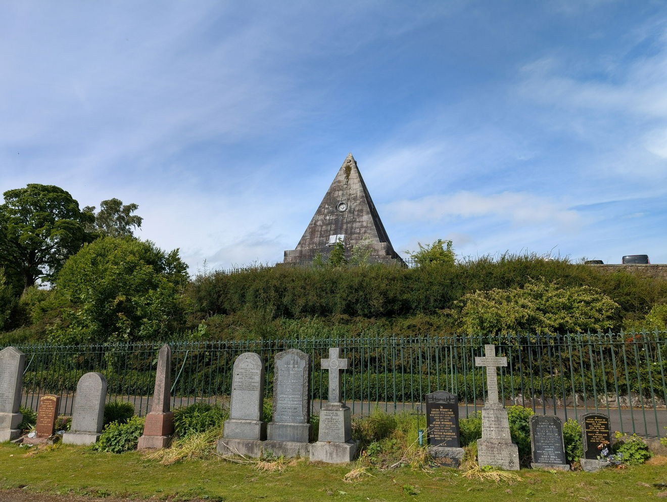 The Star Pyramid was commissioned by William Drummond in 1863, and built by William Barclay. A stone memorial for William Drummond is the only gravestone present in the Drummond Pleasure Ground. William planted the garden around the Pyramid with the trees and plants. He also paid for five of the six statues seen in various parts of the graveyard and donated trees to be planted around the National Wallace Monument.