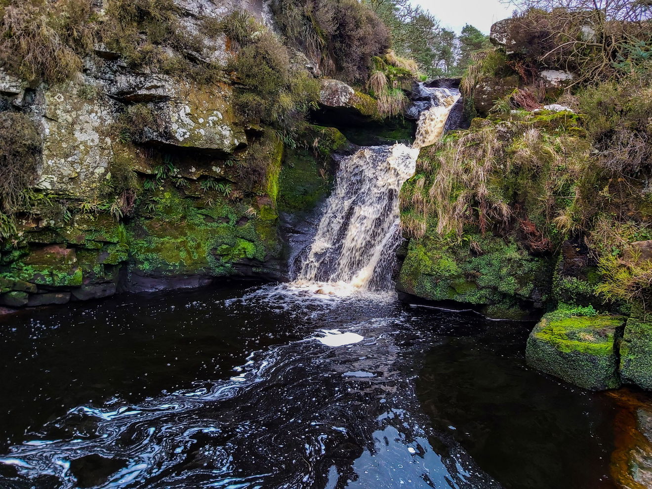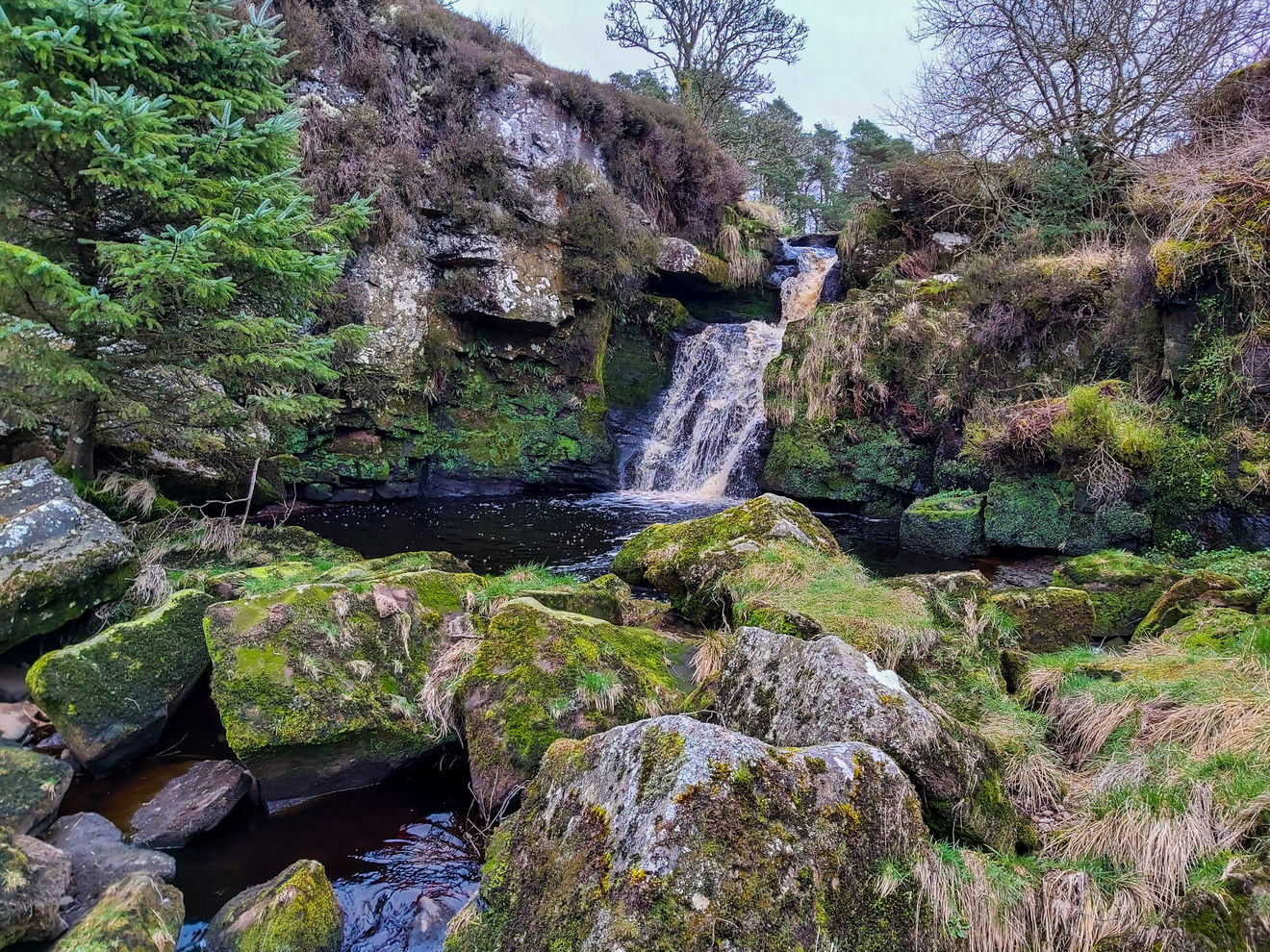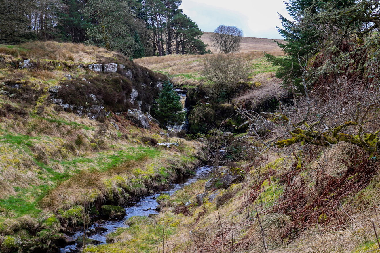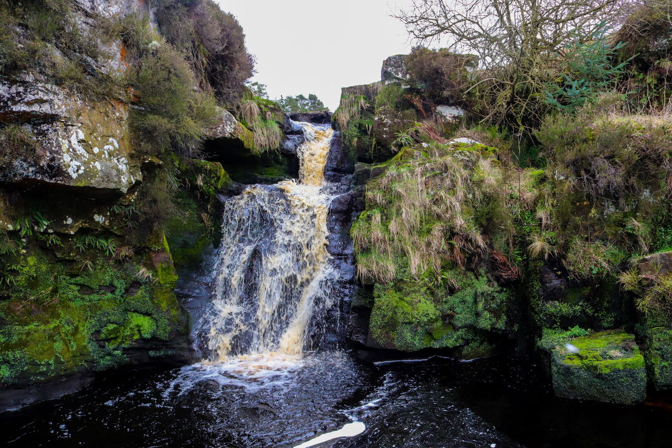 Stonehaugh Waterfall sits on the Middle Burn which feeds into the wider Wark Burn. It's a spectacular little waterfall and looks quite a picture when you get up close to it. It's surrounded by mossy rocks and trees and is very atmospheric, particularly after a rainfall when the peat-stained water runs a deep amber colour. It's a bit steep as you head down to the waterfall, so walking boots are recommended and take care on the climb down.