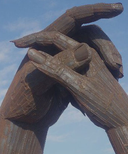 A large Corten Steel artwork of lovers' hands entwined, by Ray Lonsdale.