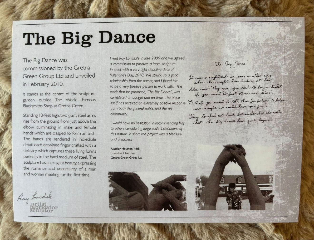 You may be familiar with Ray Lonsdale and his Corten Steel artwork. When he first started, Ray and his wife Bev, were proactive with seeking commissions. At one stage, they sent out approximately 500 brochures explaining the artwork and that Ray was open to commissions. They got one reply back. This was from Alasdair Houston MBE, Executive Chairman, Gretna Green Group. It was a serendipitous moment as Alasdair was in the market for a sculpture. They discussed ideas, and Ray came up with the bespoke The Big Dance that has become an iconic photographic opportunity. There was a tight deadline, and when finished, it took a day to remove it from his workshop for transport. People must have taken a double look as it travelled to Scotland.