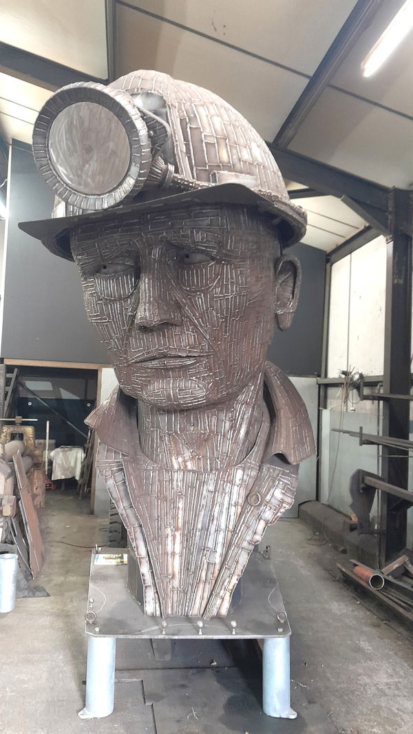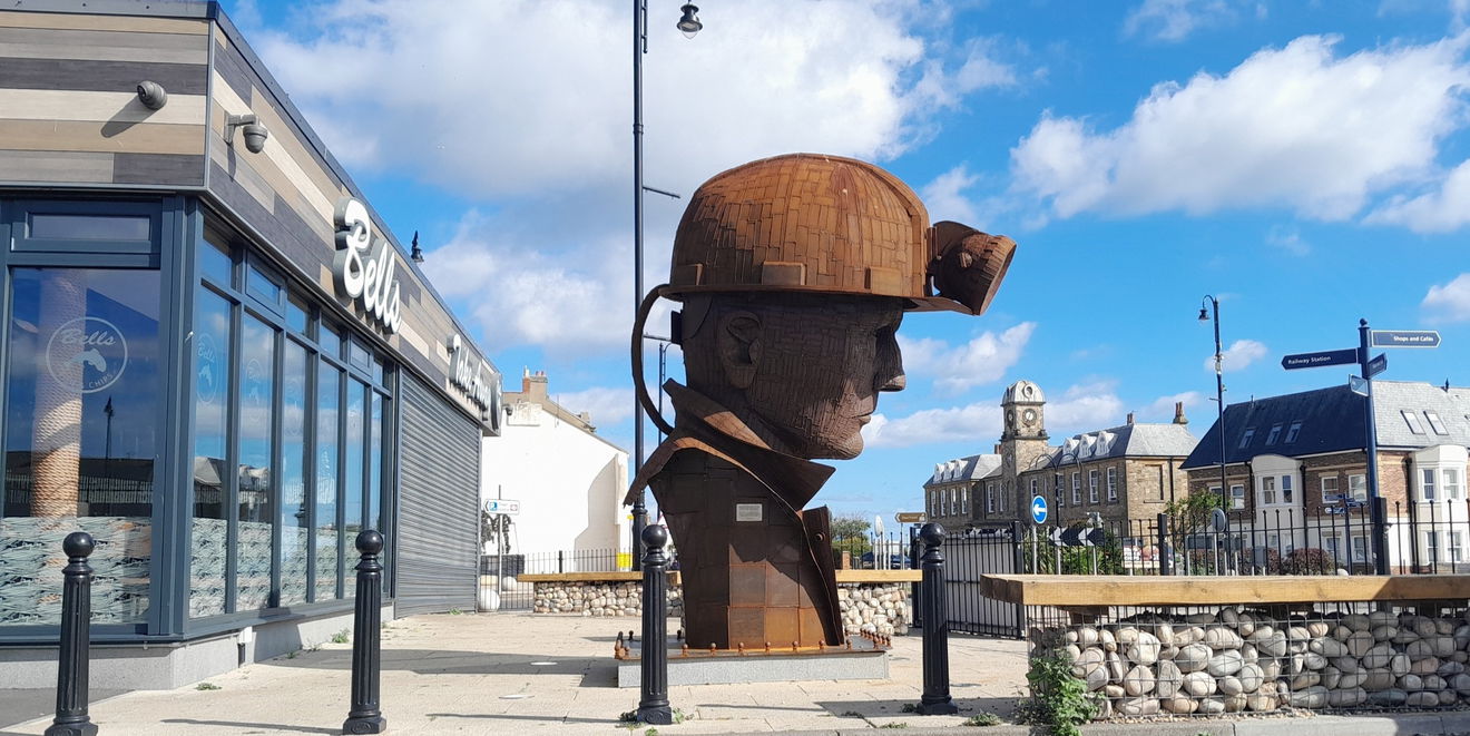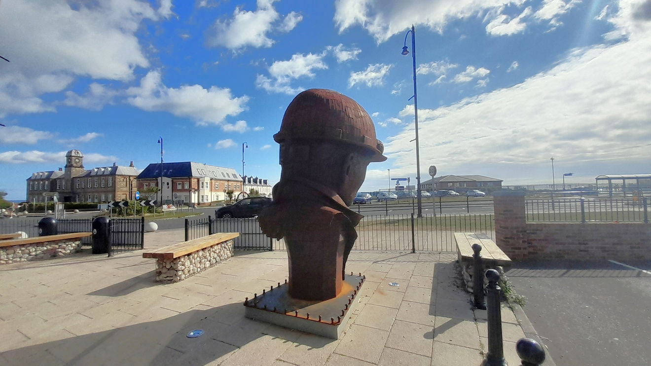A colossal costard of a Miner made of Corten Steel by Ray Lonsdale, located in Seaham.