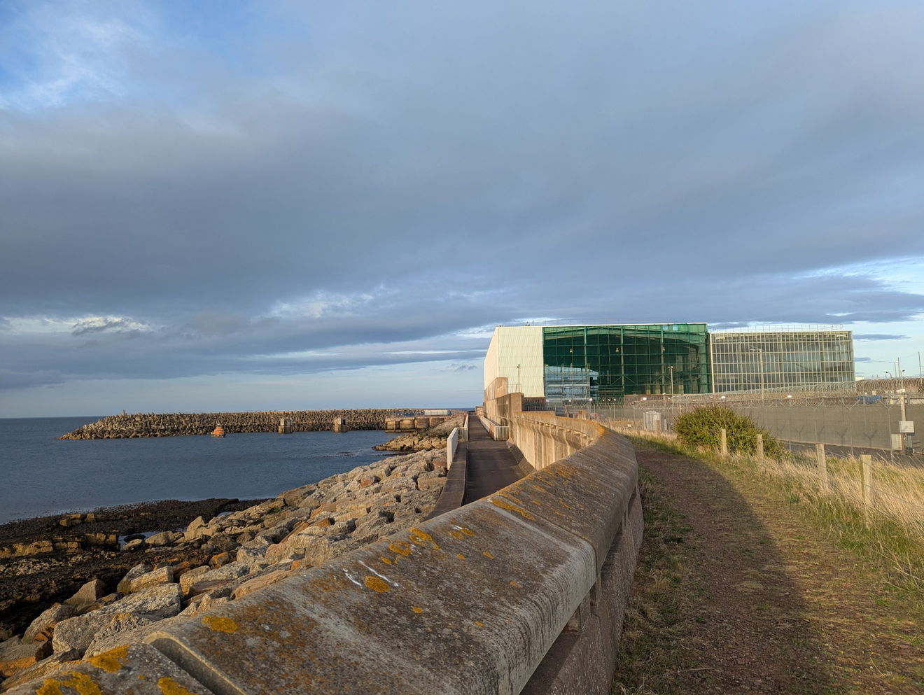 An unusual two story concrete walkway that runs around the perimeter of Torness Nuclear Power Station and includes a fenced off pier.