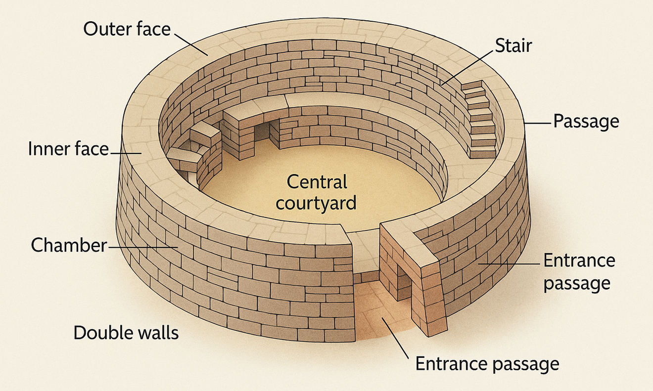A hillfort is usually a big enclosed settlement on a hilltop with ramparts or ditches around it where a whole community usually lives. But a broch is a very different beast. It's a tower-like roundhouse built in the Iron Age, made of double drystone walls with a hollow gallery inside. They're circular and often quite tall when first built, maybe 10 metres or more. Most are found in the north and west of Scotland. Here is a pic we made to show you what they would have looked like/