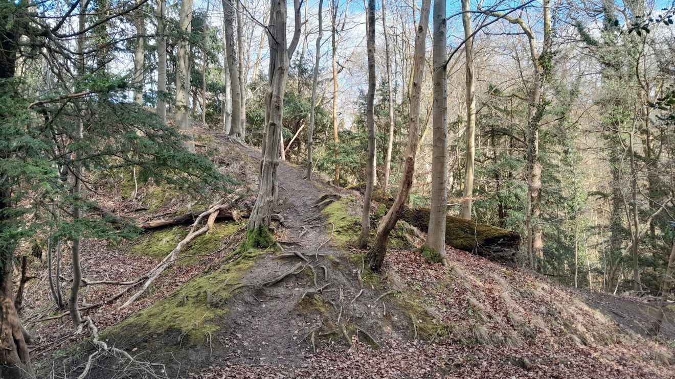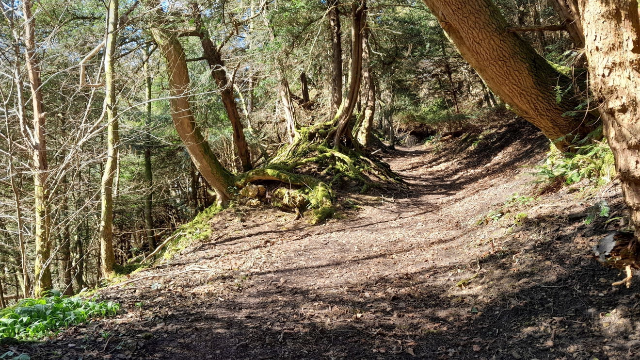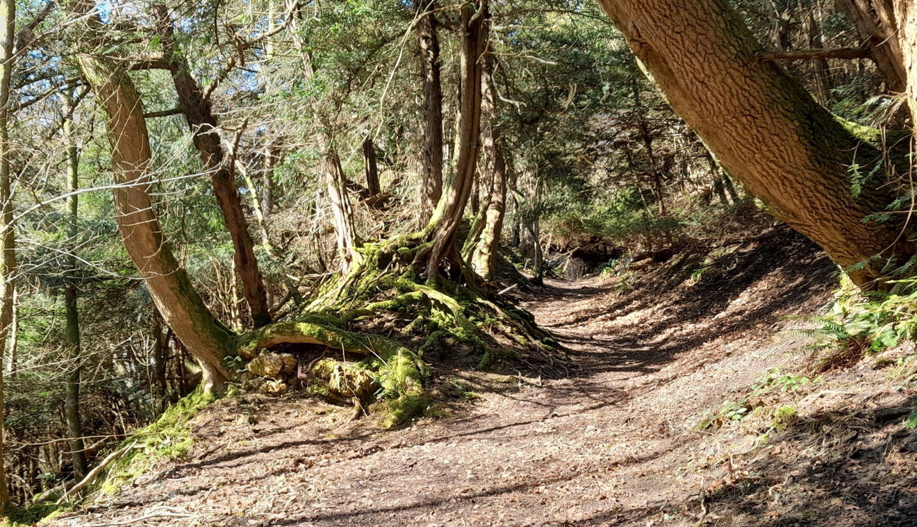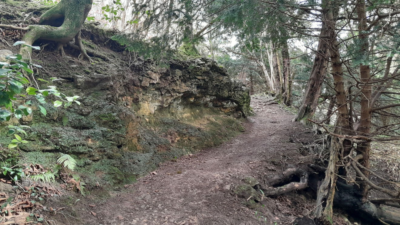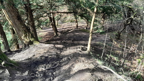 After crossing the black Devil's Bridge and surmising if the Magnesian Limestone is the Devil's scar, head left/west. This uphill stretch will keep you honest. There are some bewitching tree roots, and be careful walking on the edge of the precipice. I heard a diurnal Tawny Owl to add to the ambience.