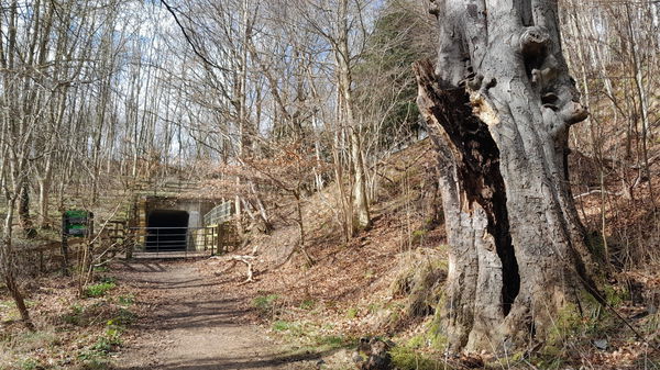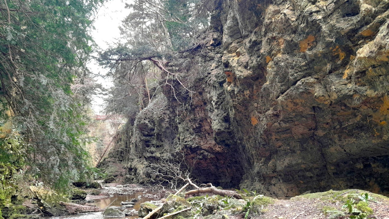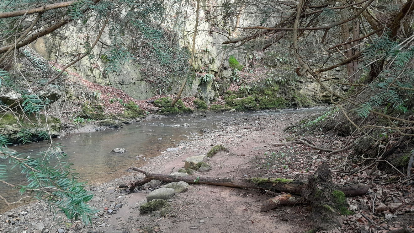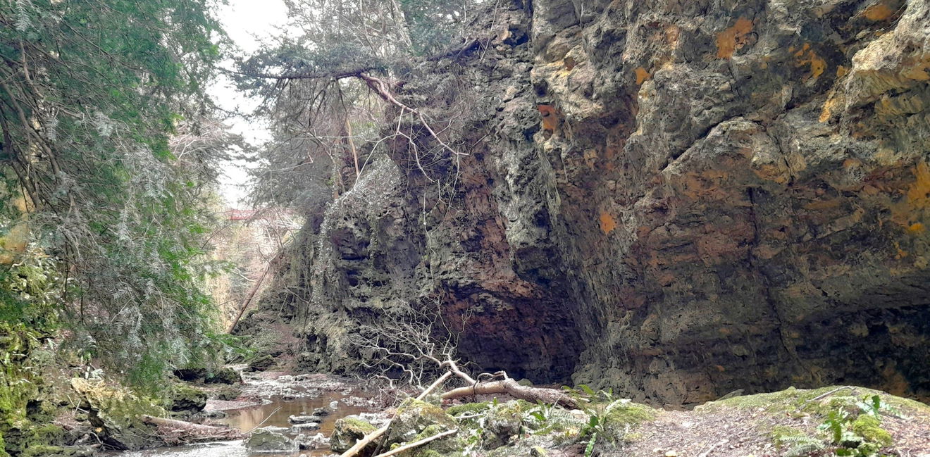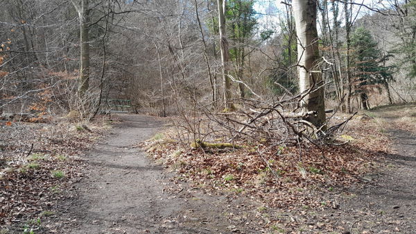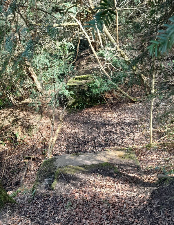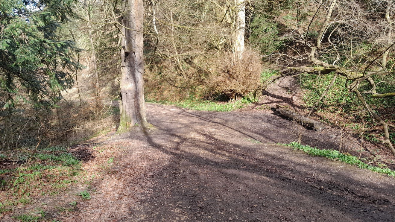 After crossing the black Devil's Bridge and surmising if the Magnesian Limestone is the Devil's scar, head left/west. This uphill stretch will keep you honest. There are some bewitching tree roots, and be careful walking on the edge of the precipice. I heard a diurnal Tawny Owl to add to the ambience.