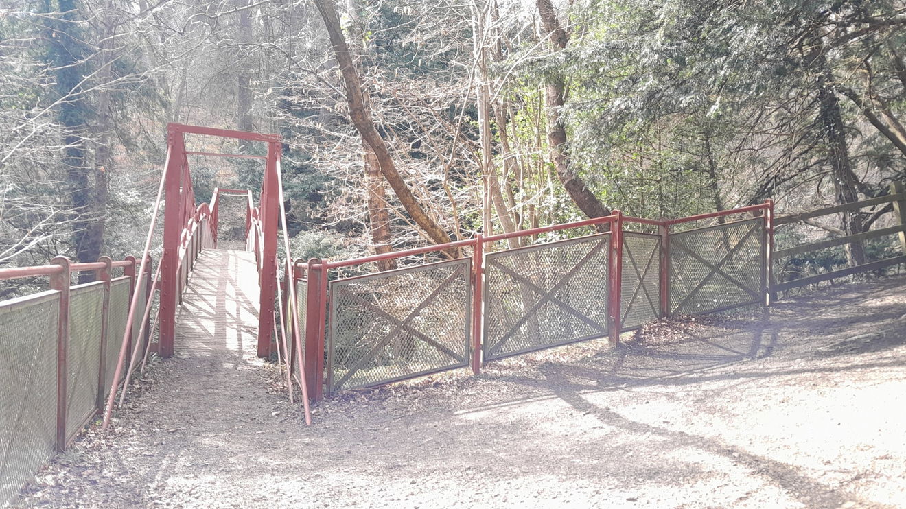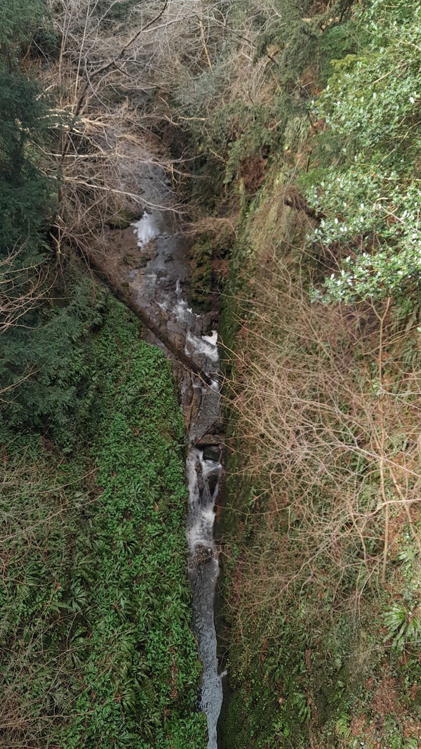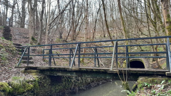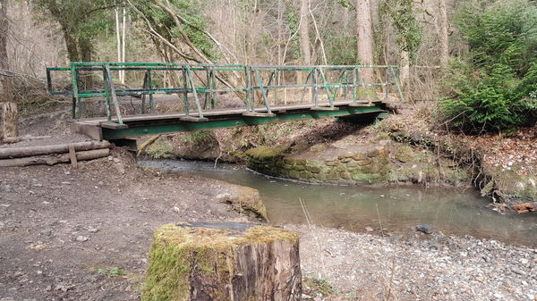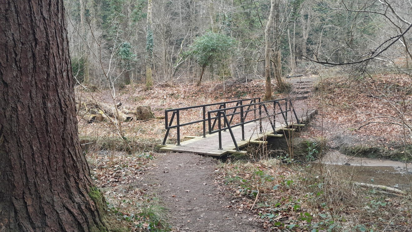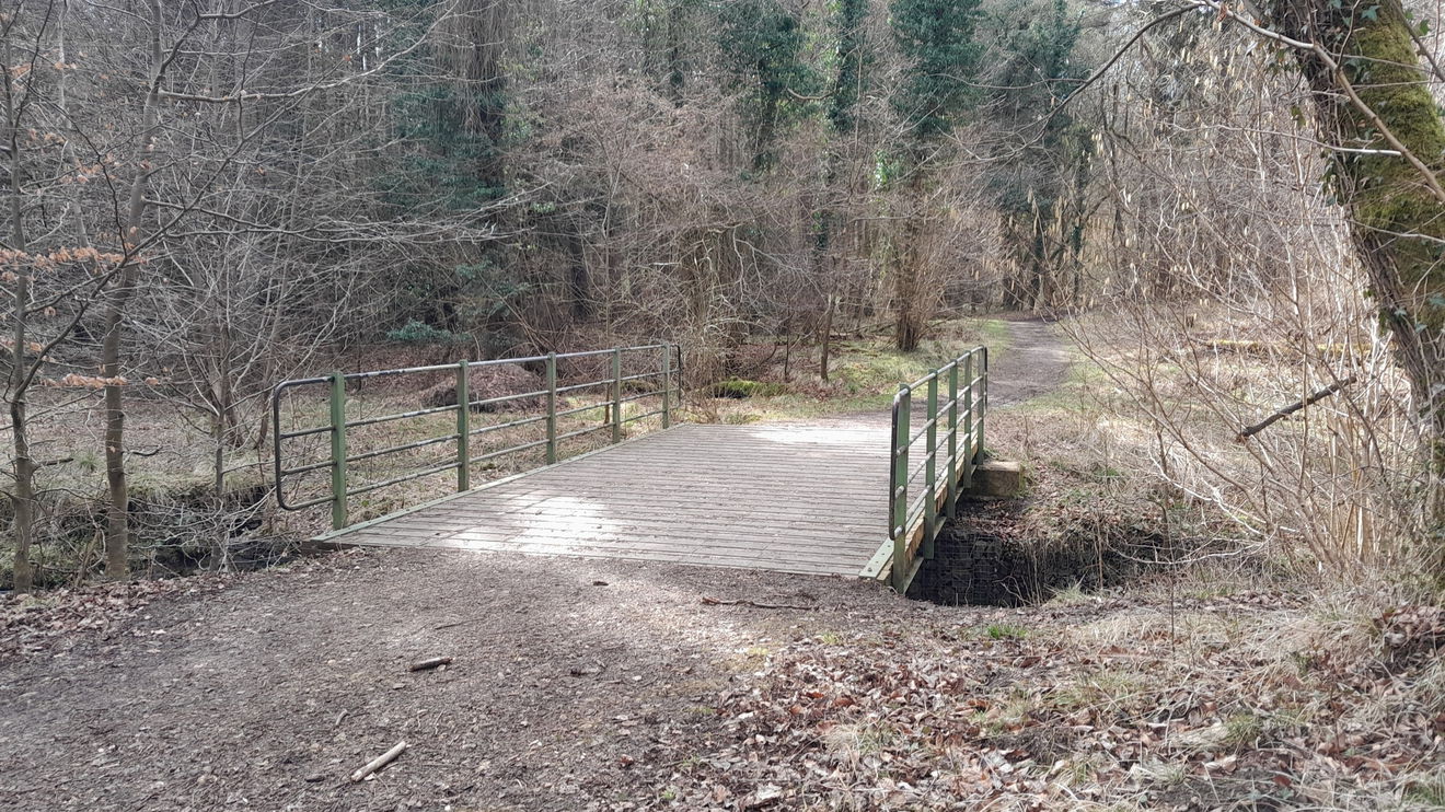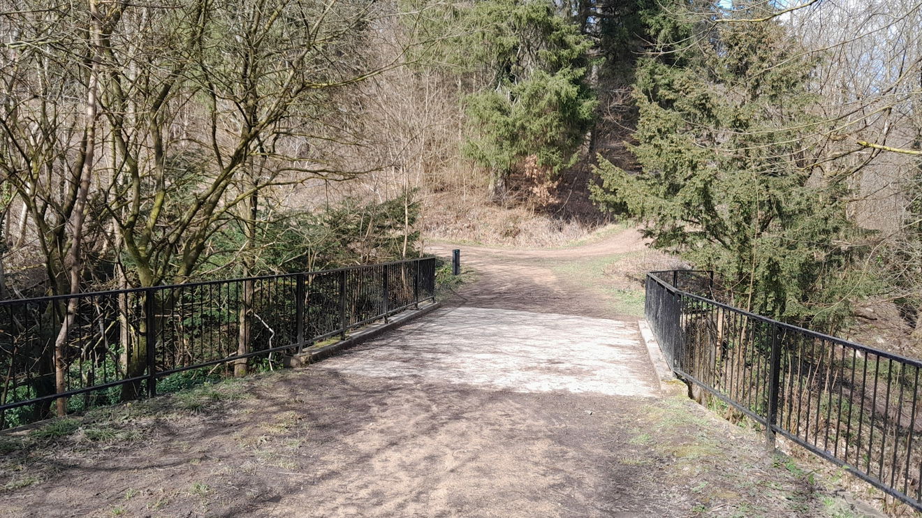 At the top head back east/left. This bit is quite level and runs along the top of the dene. Don't be tempted to take the first left path, continue and cross over a beck (pipework) then head left and you will come back to Green Bridge #1. Cross over and head left. You cross over your tracks as this is where the Black Bridge is.