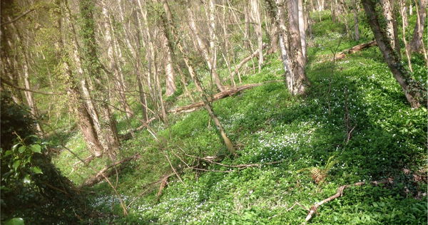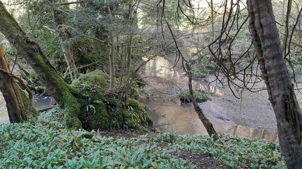 Wild Garlic is abundant throughout the dene in spring. At the end of this path, turn left onto a tarmac road.