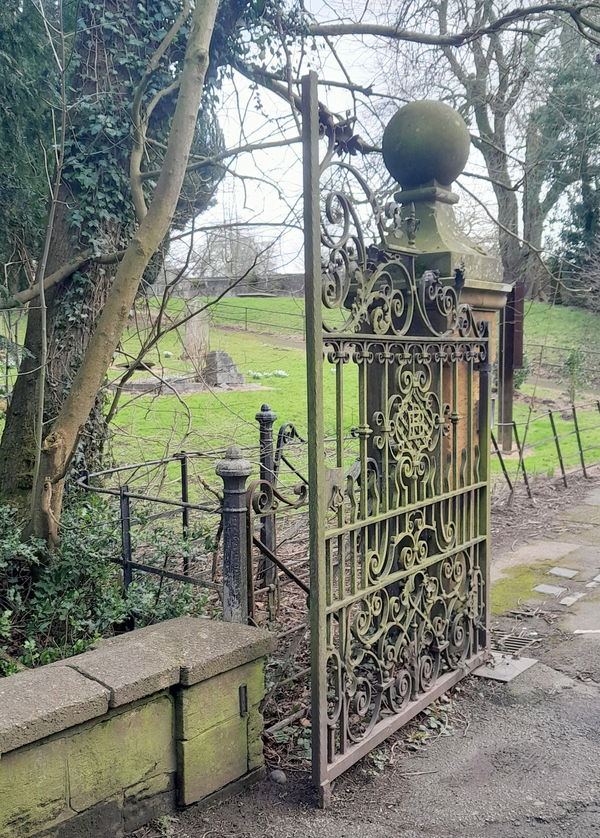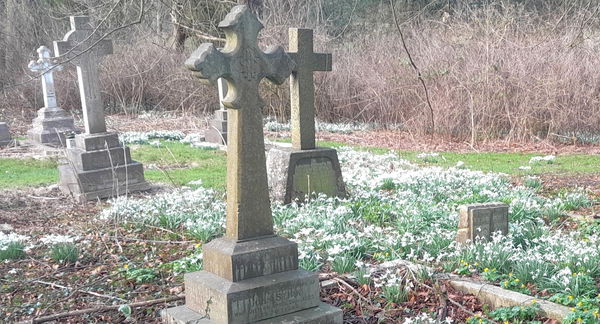 You will go over aroad bridge and can look back at the beck. It would be rude not to pop along and look at the churchyard of St. James, which is through the gates and is on your left. The churchyard is a British classic, especially with snowdrops in February.