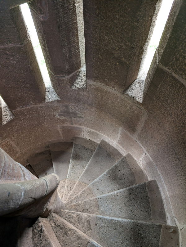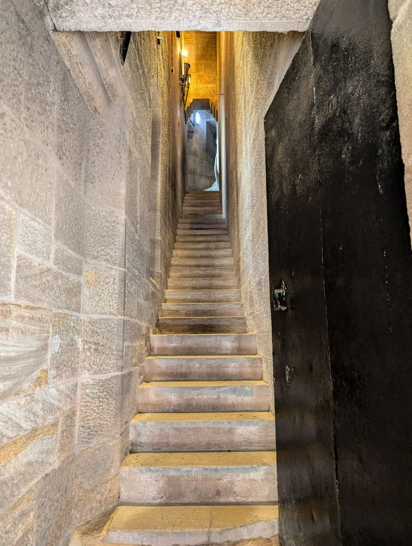 You soon reach the first set of spiral steps, in total there are 75 of them to reach the first floor. Beware of people coming down, as they are bidirectional.