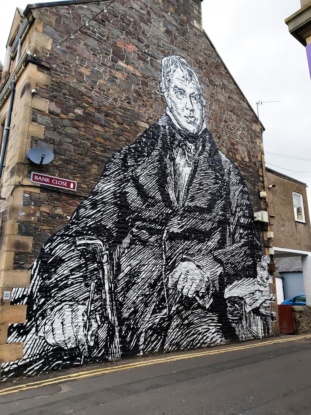 This mural of Walter Scott is part of a series of artworks in Galashiels linked to the Build a Better Gala project funded by South of Scotland Enterprise and Scottish Borders Council. Local artists and members of the community were consulted to help with the design and London based Global Street Art hand painted the vibrant mural in August 2022. It was painted onto the gable end of a building on Bank Close and is very striking, using just black and white paint.